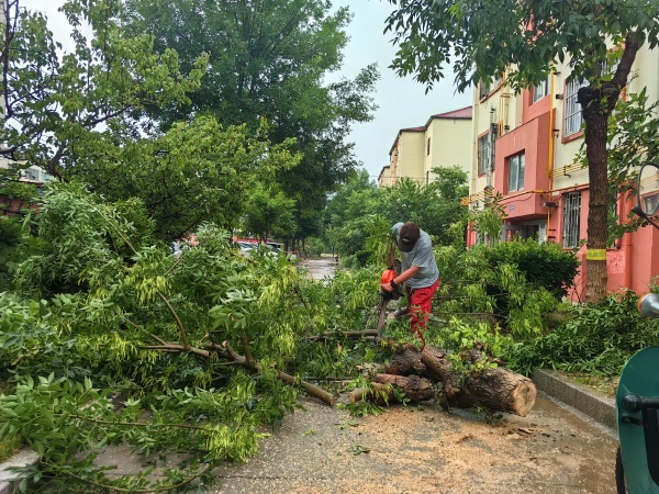 风雨中,紧急求助接连不断。光明二区66号楼污水井突发返水,代红梅经理接到居民反馈,放下碗筷便冒雨赶赴现场,挥动扫帚奋战一个多小时,终将积水清除干净。建设二小区15号楼与19号楼间,狂风将大树拦腰刮断横卧路中。杨青华经理接报后5分钟内即携油锯带领队伍抵达。锯断树干、清运树枝,紧张作业中,一位热心居民主动加入,与物业人员并肩清障,构成风雨中最暖心的画面。不足一小时,道路恢复畅通,赢得往来居民纷纷点赞。