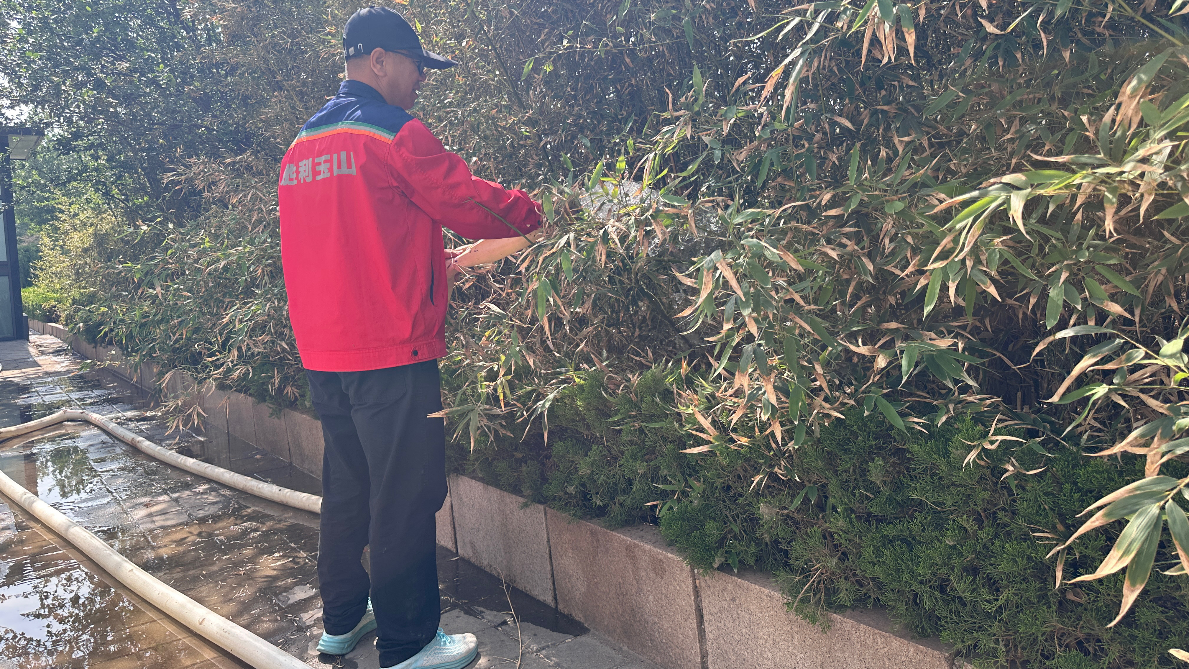 胜兴事业部的工作人员手持水管,穿梭在小区的各个角落,对绿化带、花草树木展开集中浇水作业。在浇水过程中,他们全神贯注、一丝不苟,对于新栽种的苗木,他们蹲下身子,仔细观察土壤的渗透情况,直至水分完全浸润根系周边的每一寸土壤。