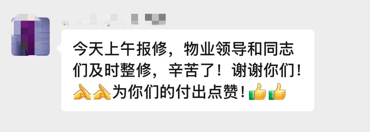 维修效果立竿见影,95号楼居民在业主群内纷纷为物业的及时响应与高效处置点赞。一句发自肺腑的肯定,是对幸福事业部日常工作的最佳认可。
