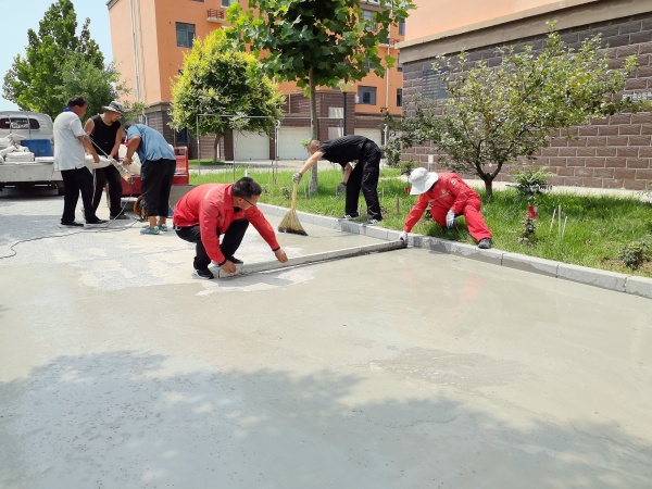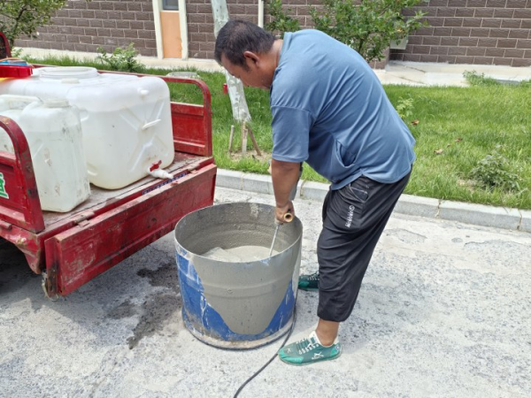 在幸福事业部王泽艳经理的带领下,团队采用了标准化的新型砂浆修补工艺。整个施工过程科学严谨,步骤清晰: 1. 彻底清理: 移除破损区域的碎石、尘土、杂物,确保基础牢固。 2. 高压冲洗: 使用清水彻底冲洗作业面,去除浮尘,增强新旧材料粘结力。 3. 精准配比:严格按照科学比例调配新型修补砂浆,确保材料性能最优。 4. 精细刮平:将砂浆填入坑槽,仔细刮平,力求与原有路面完美衔接,平整美观。