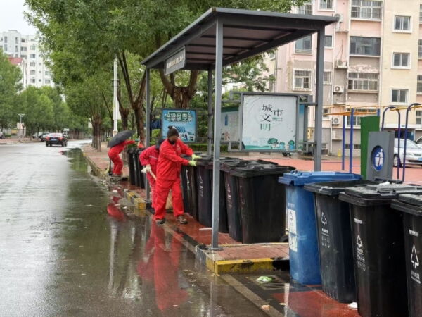 保洁人员则聚焦垃圾投放点的清洁维护,及时清扫垃圾点散落垃圾,对垃圾桶内外进行彻底冲洗和消杀,擦拭周边地面的污渍,确保居民能够在整洁的环境中正常投放垃圾。