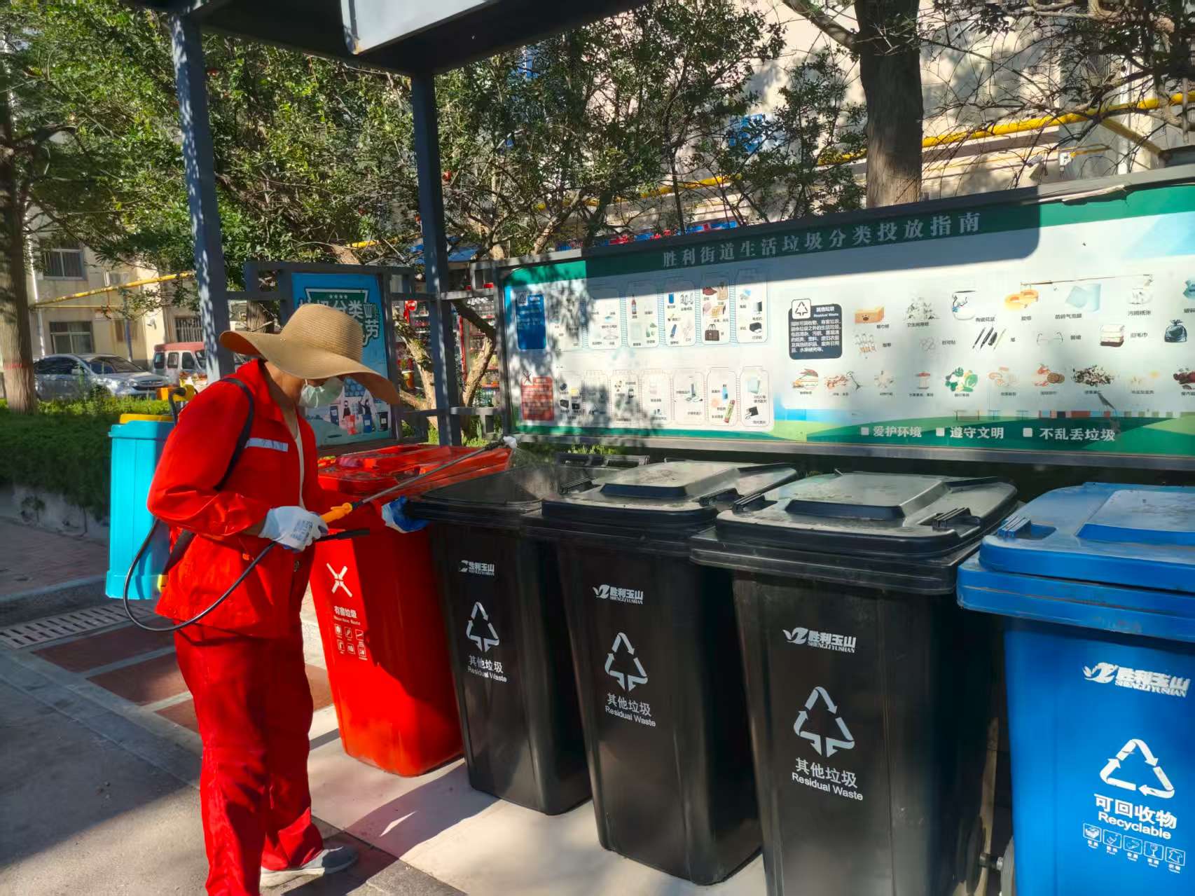 胜利项目的工作人员携带配比好的消毒液和清洁工具,对小区内所有垃圾桶及周边区域进行“无死角”处理。他们喷洒消毒液,重点擦拭把手、桶盖等居民高频接触的部位。对于垃圾桶周边的地面,也仔细喷洒消毒水,防止细菌滋生。