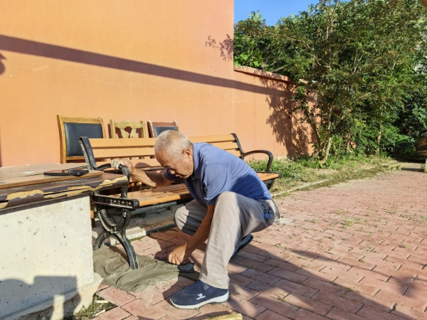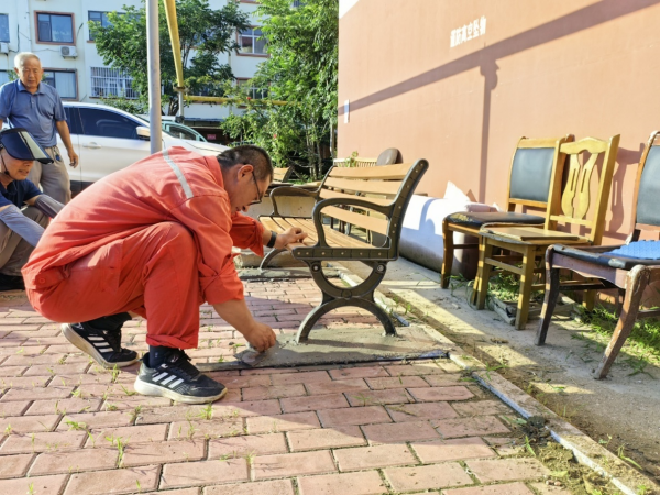 这事儿,得从建设物业经理杨青华的一次巡查讲起。前几天他巡查路过这儿,看见老人们挤在几张旧椅子上聊天,有的椅子腿晃悠悠的,看着就让人捏把汗。“得赶紧换!”杨青华没犹豫,当天就开始张罗备料。今天烈日炎炎,他带领物业工作人员顶着阳头,在17号楼东头忙碌着:选位置、打眼、安装。尽管汗水打湿了衣服,大家仍旧坚持着,顺利完成休闲椅的安装工作。为了确保椅子稳固,杨经理安排工作人员和水泥进行加固。围观群众李大爷见状主动参与加固工作,他凭借多年瓦工经验,自带着工具泥抹子,仔细检查、找平,还指导大家加固技巧。居民们纷纷点赞,现场热闹又温馨。