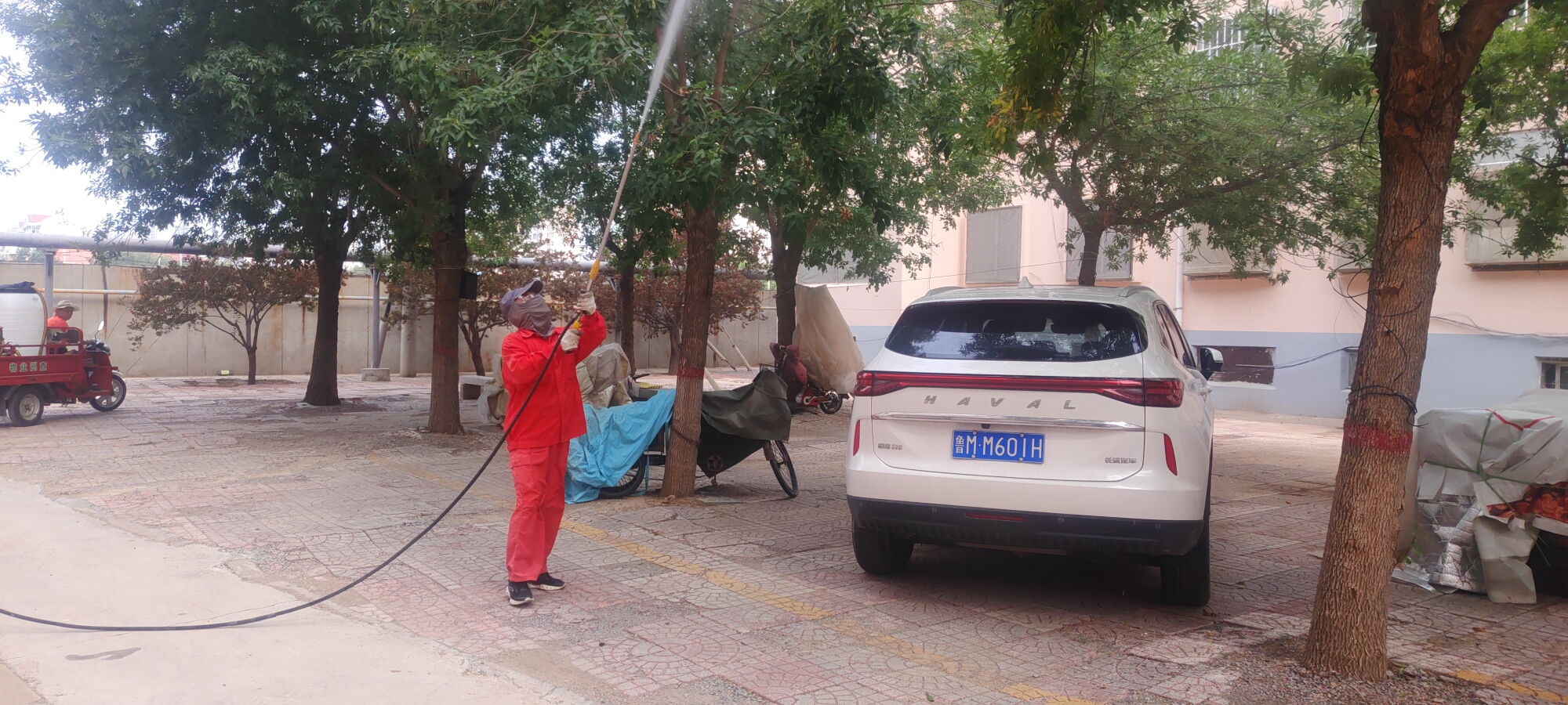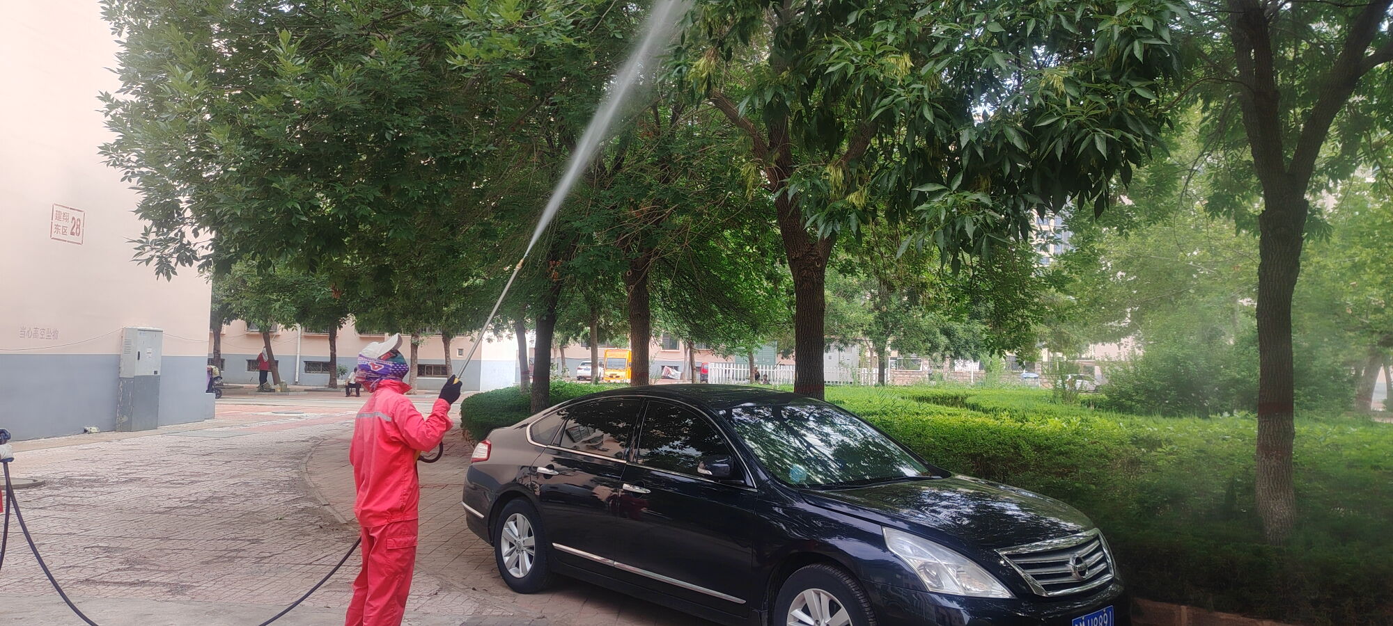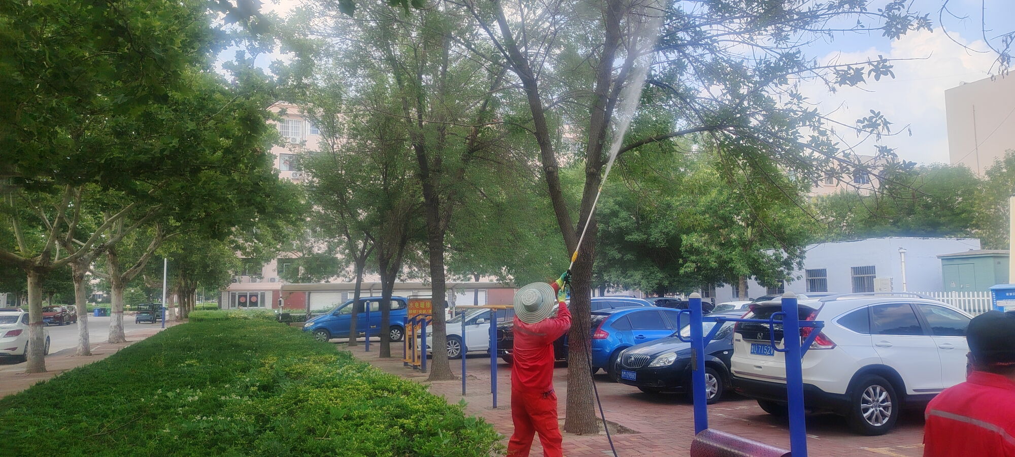 工作人员按照劳保防护戴好手套等劳保防护,并提前用喇叭通知居民在室外特别是树下晾晒衣物、打牌乘凉等注意安全;再用打药车高压喷洒农药,将小区内所有树木绿植逐一进行喷药做好美国白蛾、蚜虫、刺娥等病虫害防治防治工作。