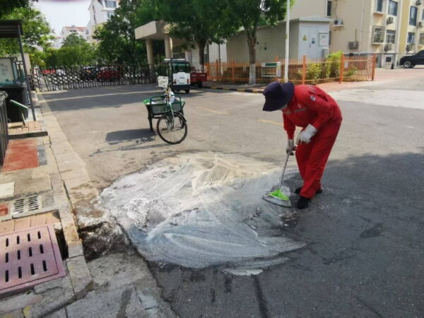 8月22日早上,锦华事业部职工发现锦华九区垃圾投放点附近地面出现大片油污,不仅影响了小区整体环境卫生,还因地面湿滑给居民投放垃圾带来不便,存在安全隐患。