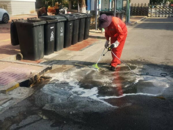 发现问题后,物业职工第一时间行动起来。考虑到油污难以直接清除,工作人员迅速调配洗洁精等清洁用品,先用塑料扫把蘸取洗洁精对油污区域进行反复擦洗,确保将附着在地面的油脂彻底分解。随后,他们接上高压水枪,用清水对擦洗后的地面进行全面冲洗,直至地面恢复整洁。经过近一小时的细致清理,原本油污遍布的区域焕然一新,既消除了安全隐患,也让居民投放垃圾时的体验更加舒适。