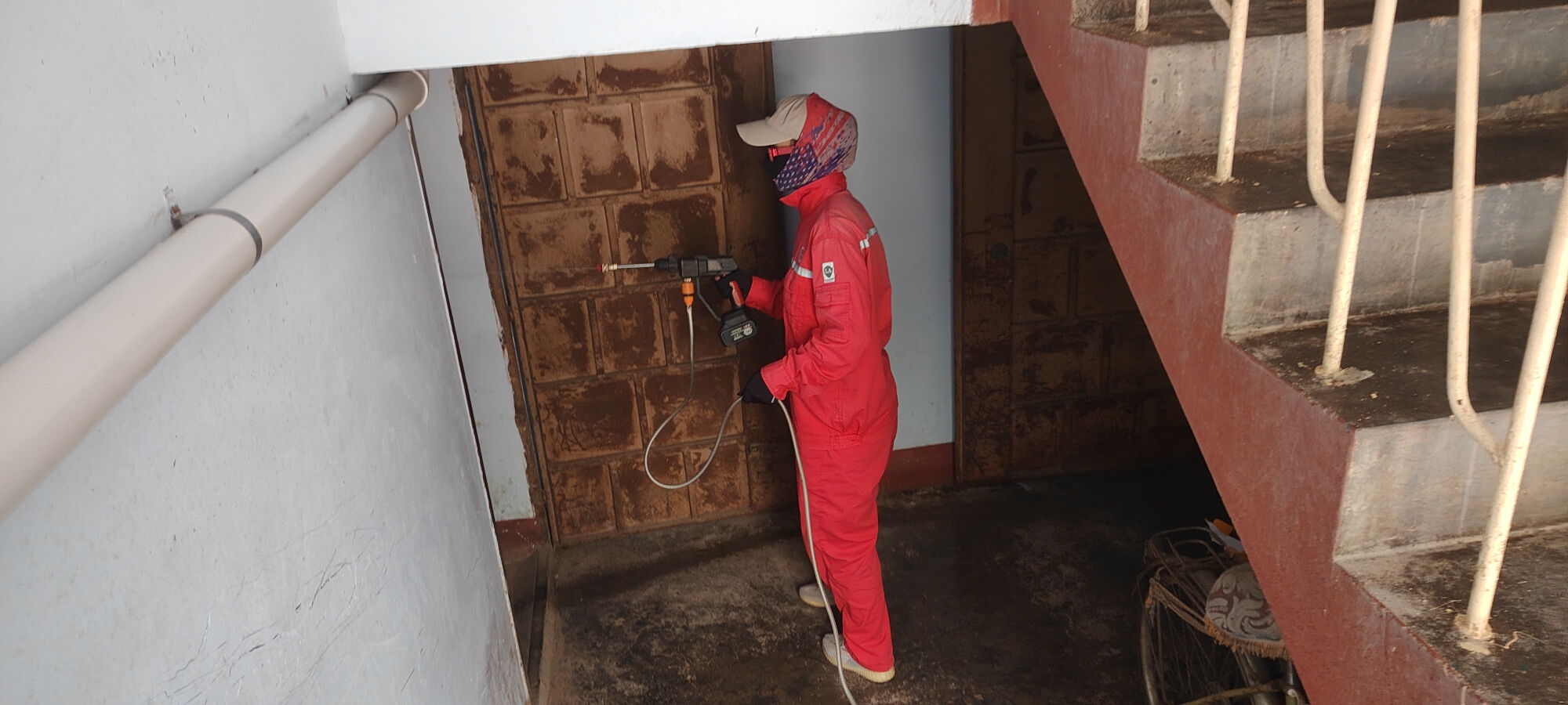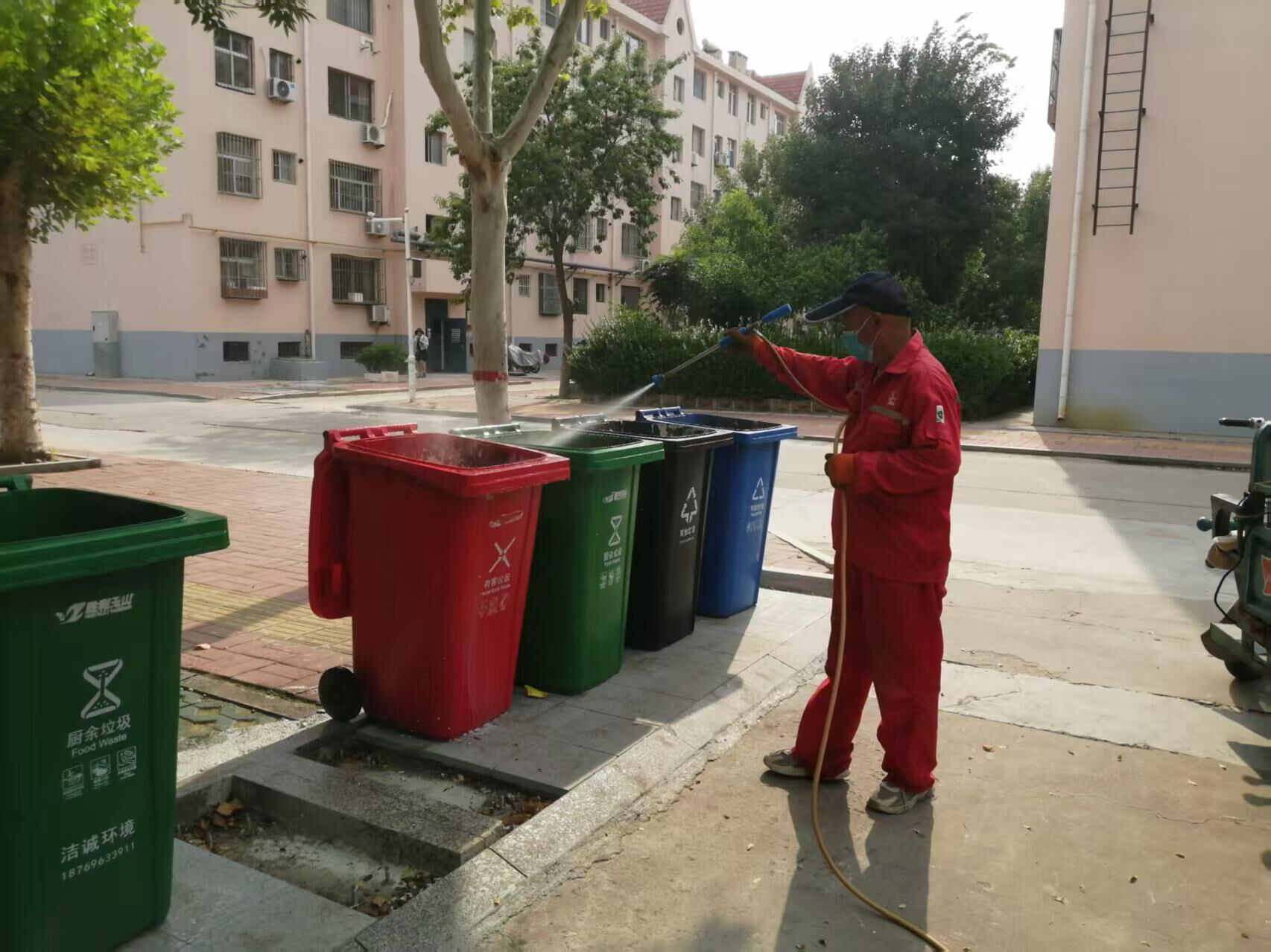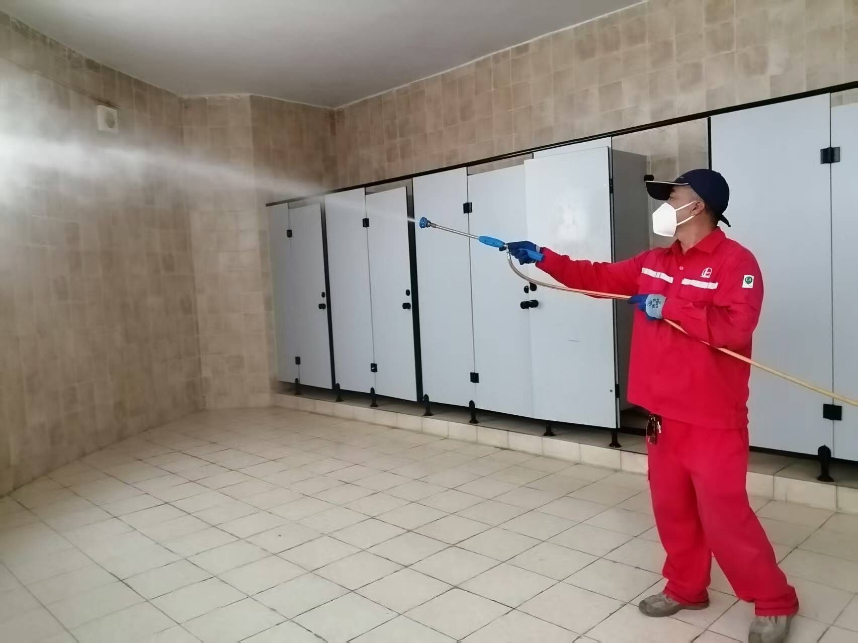 该项目由专人负责每天上午、下午对4处公厕及20处垃圾点和百余个垃圾桶进行保洁、清洗、消杀工作;绿化区定期喷洒药物,重点针对草丛、花丛、树根等蚊虫藏匿处;高大树木启用加长喷雾杆,确保药剂直达树冠;每次雨后公共区域消杀全覆盖,楼宇内部同步开展逐层消杀,保洁人员从顶层至底层作业,聚焦楼梯扶手、墙面、地面及窗台等高频接触区,强化药剂覆盖,阻断接触传播可能。