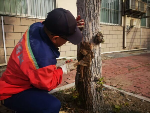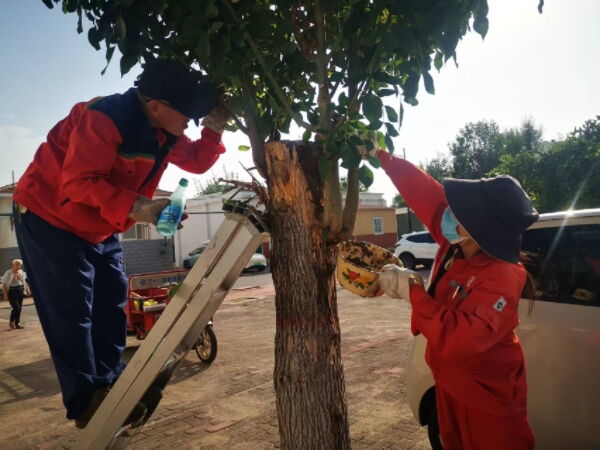 行动中,绿化职工以“早发现、早防治”为原则,对小区内乔木、灌木开展拉网式排查。职工们携带工具穿梭于楼栋间、绿地中,重点检查树木枝干是否有虫粪、木屑堆积,仔细查看树皮缝隙、枝干伤口等蛀干害虫易侵入部位,确保不留防治“死角”。