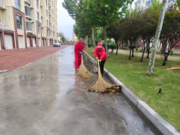 秋雨连绵,落叶纷飞,这本该是诗意盎然的季节,却为小区的防汛和环境卫生带来了严峻挑战。幸福事业部冒雨坚守,切实保障了业主的出行安全与居住环境。