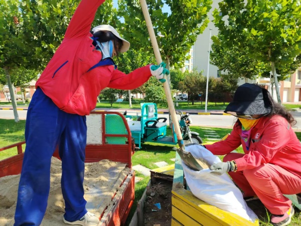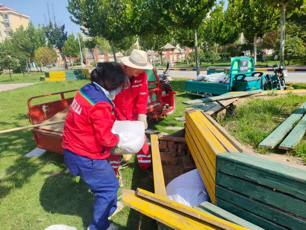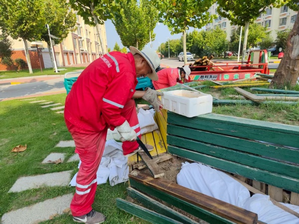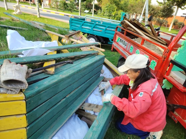 维修过程中,物业团队采用了一种既环保又稳固的修复方案:先将沙袋填充至树凳内部基底,再利用其承重性与适应性增强结构稳定性,最后重新安装加固原有木板。这一做法不仅有效延长了树凳的使用寿命,更避免了传统硬化修复对树木生长可能造成的影响,体现出物业在细节处的用心与专业。