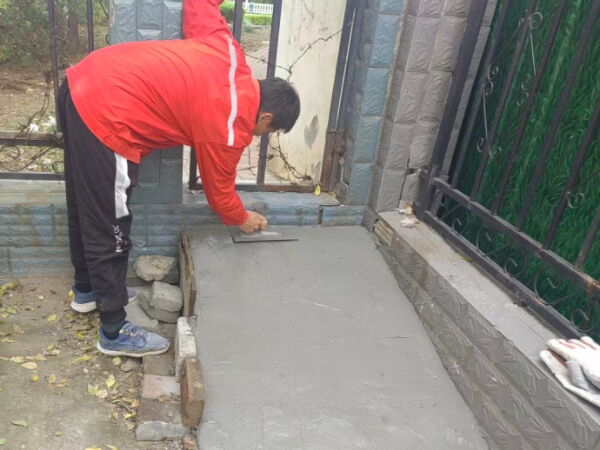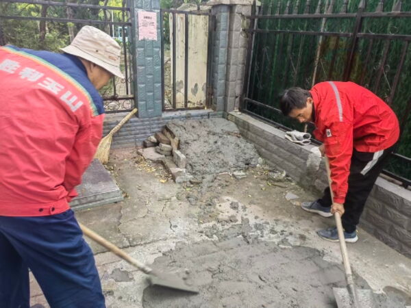 接到反馈后,锦华事业部高度重视,维修人员第一时间赶赴现场勘察,结合现场地形与居民出行需求,迅速制定改造方案。为尽快解决问题,物业筹备水泥、沙子、花砖等材料,严格按照施工流程推进改造工作。施工过程中,工作人员先对原有台阶基础进行平整处理,再有序铺设花砖,确保坡面坡度平缓、便于骑行;随后用水泥仔细填缝,增强结构稳定性,最后对坡面进行整体抹平,进一步提升通行舒适度与安全性。