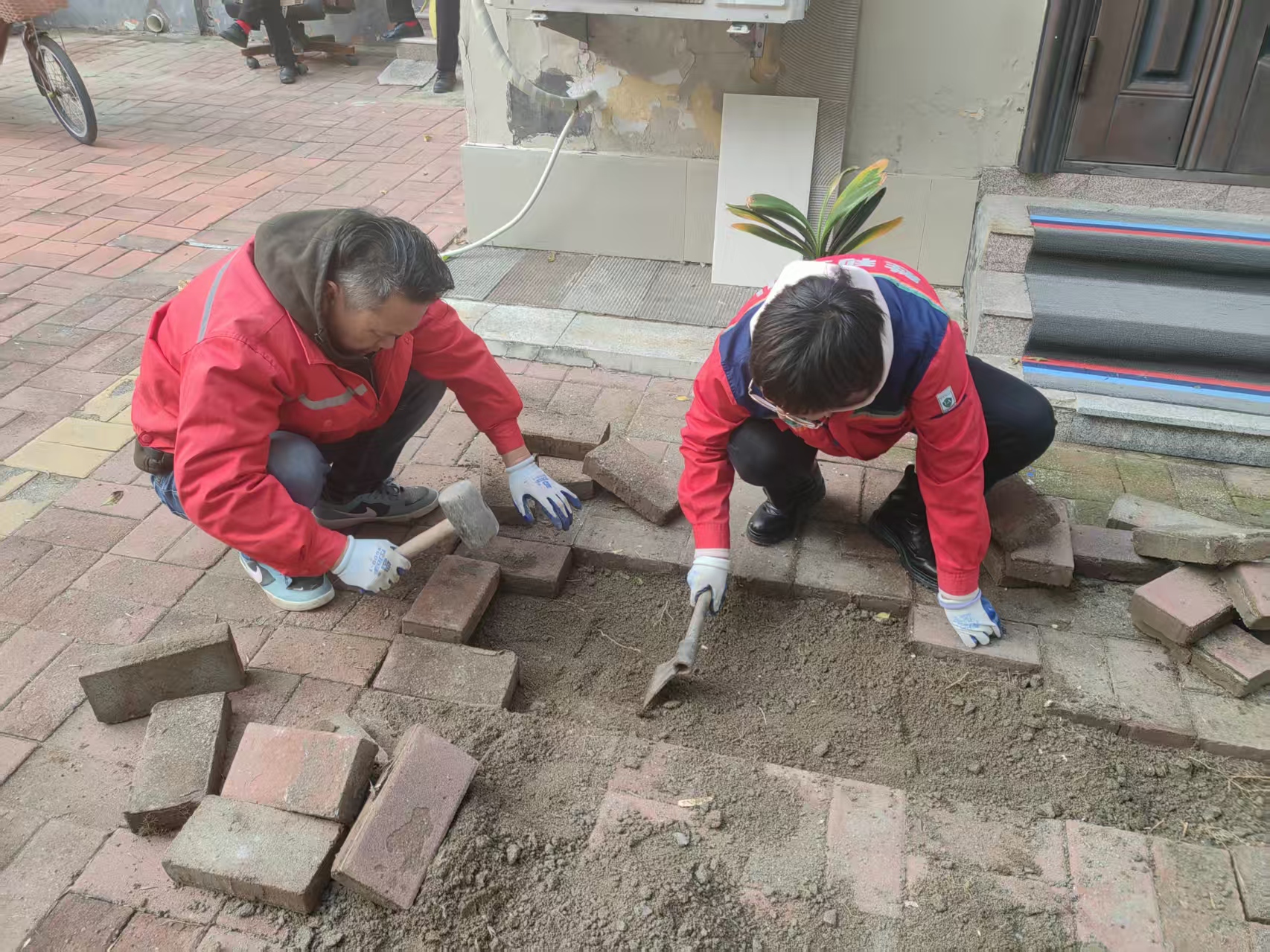居民反馈问题后,胜利玉山物业瑞达事业部胜利项目部迅速响应。工作人员第一时间抵达现场勘查,精准定位问题根源并制定修复方案;待天气放晴,施工工作立即启动,先小心撬开拱起变形的花砖,接着对“肇事”树根进行精准修剪以避免后续再次顶起路面,随后清理地基杂物、重新找平地面,最后将花砖严丝合缝铺回,让门前路面恢复平整。