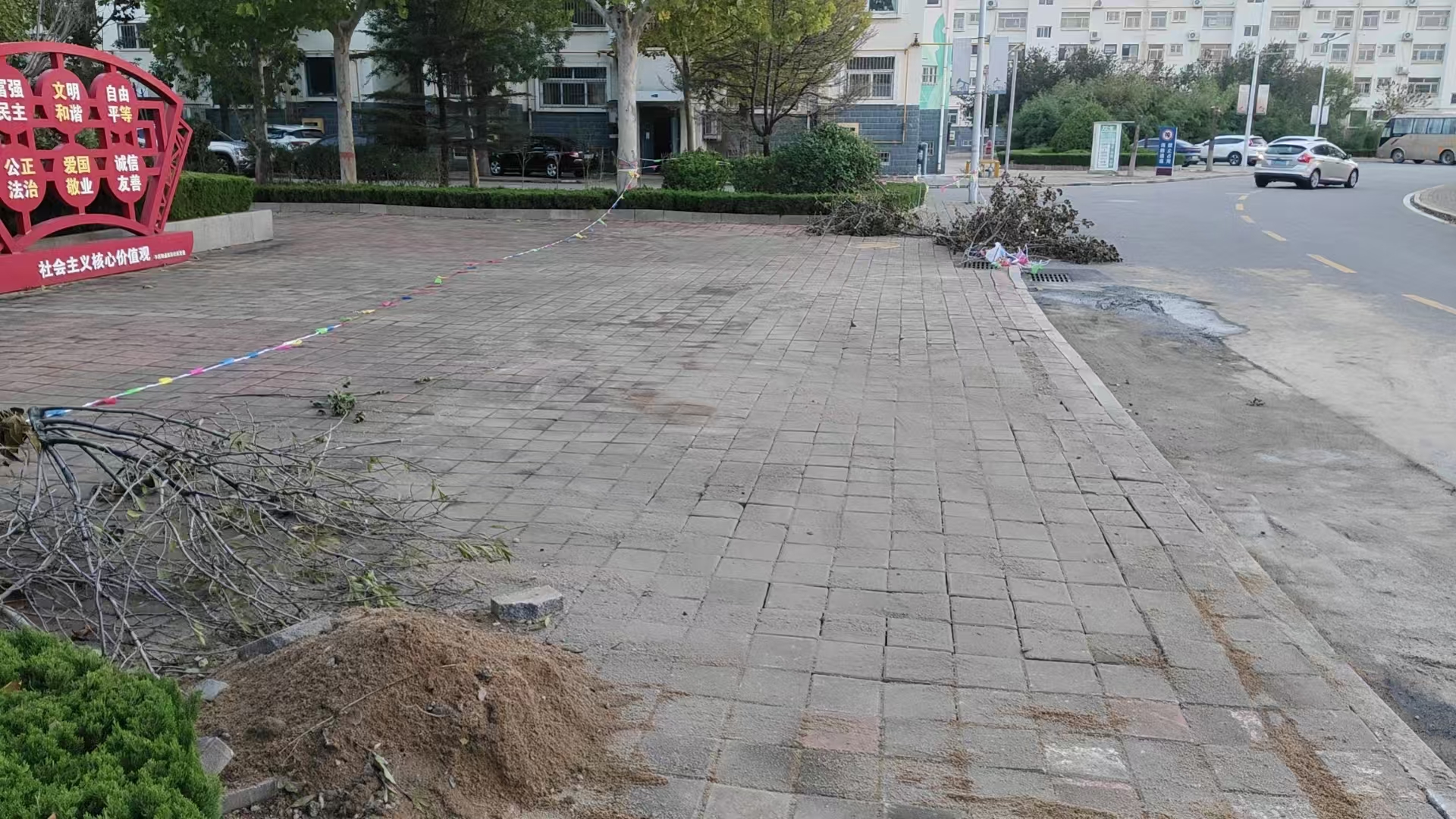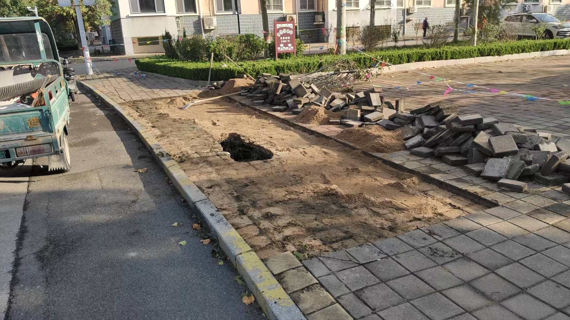 近日,工作人员发现一处路面出现明显塌陷迹象,周边路面亦伴随轻微裂缝。该隐患若未及时处置,极易引发行人绊倒、跌落等安全事故。为防范意外发生,胜利玉山物业胜兴事业部第一时间采取应急措施,迅速拉起警示带、设置警示牌,同时汇报现场情况,明确说明塌陷具体位置,等候专业维修人员到场。维修人员抵达后,立即对塌陷原因展开初步勘查,并同步启动维修作业。