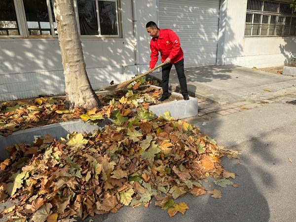 经过大家齐心协力的劳动,清扫过的路面干干净净,仿佛能听见大地安详的呼吸。那些落叶被收集起来静静等待,将化作春泥,滋养来年的新绿。落叶飘飞的季节很美,劳动者们俯身清扫的背影也成为深秋最暖的风景。