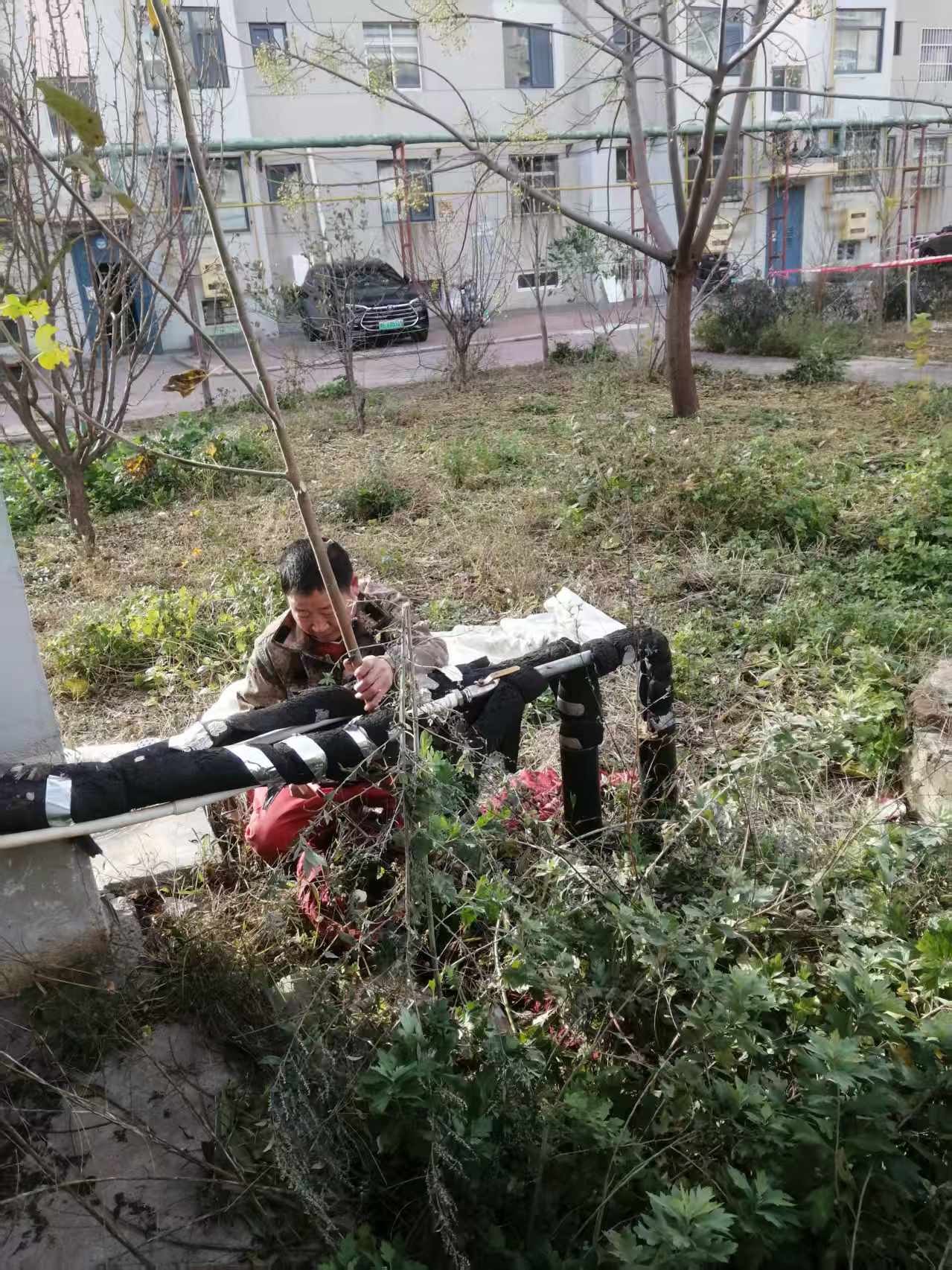 11月17日上午8点左右,室外的气温还在零度徘徊,胜利玉山物业辛兴事业部瑞景项目维修工张活常骑着载着保温管、旧棉絮、毛毡、塑料薄膜等材料的三轮车来到瑞景小区公厕背面,准备对通往公厕的暖气管线进行保温处理。