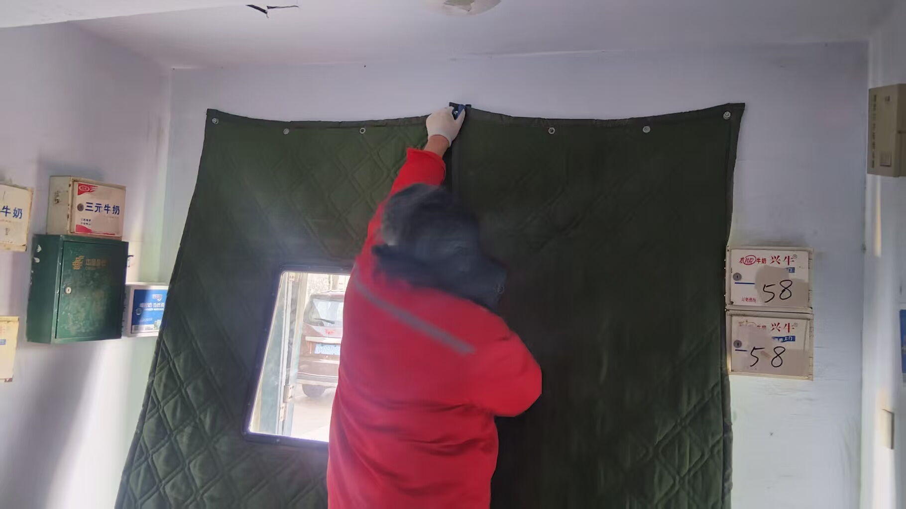 工作人员不畏严寒,联手合作为小区2栋高层楼房的5个单元安装冬季门帘。他们很细心的测量门口的宽度和高度,确保门帘的尺寸合适。确定好安装位置,用钻头打孔安装膨胀螺栓,调整门帘的位置并固定在膨胀螺丝上测试和修正。安装完成后,用手轻推门帘,确保门帘能够顺利打开和关闭,检查安全性和稳固性。