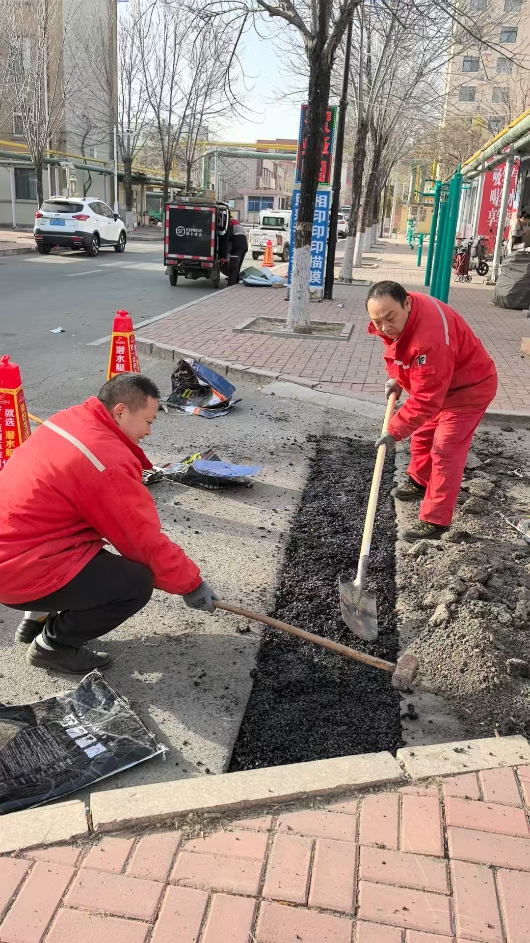 位于景苑中区8号楼南面路口,作为小区交通要道,紧邻快递网点,日常车流量非常大,长期的车辆碾压导致路面出现多处坑洼,不仅影响通行舒适度,还存在一定的安全隐患。为切实解决业主出行难题,景苑事业部没找外包施工队,而是决定组织员工自主开展路面修缮工作。