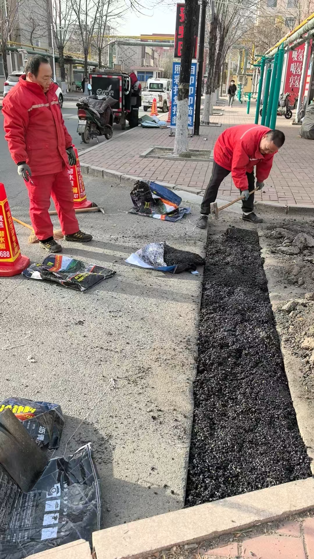 施工过程中,大家分工明确、默契配合,有的负责清理路面杂物和坑洼处的松散泥土,确保基底干净平整;有的专注搅拌路面维修冷补材料,保证材料质地均匀;有的则将冷补料快速均匀铺入凹陷区域,随后使用专业压实设备反复碾压找平,确保冷补料与原有路面紧密贴合、高度一致。从清整基底到填铺压实、精准抹平,仅用半天时间,原本破损的路面就被修整得平整光滑,彻底消除了通行隐患,保障了周边业主和车辆的通行安全。