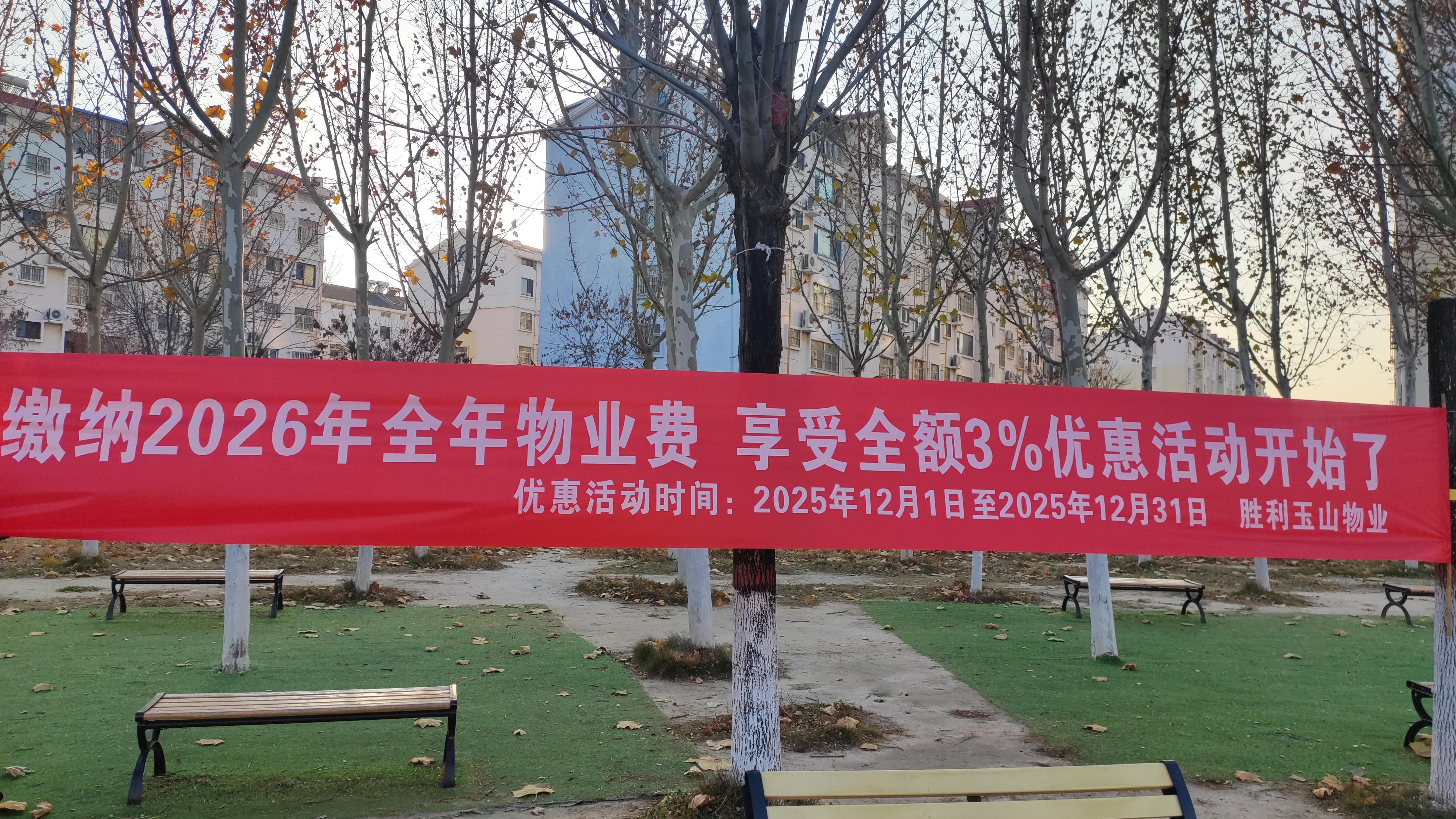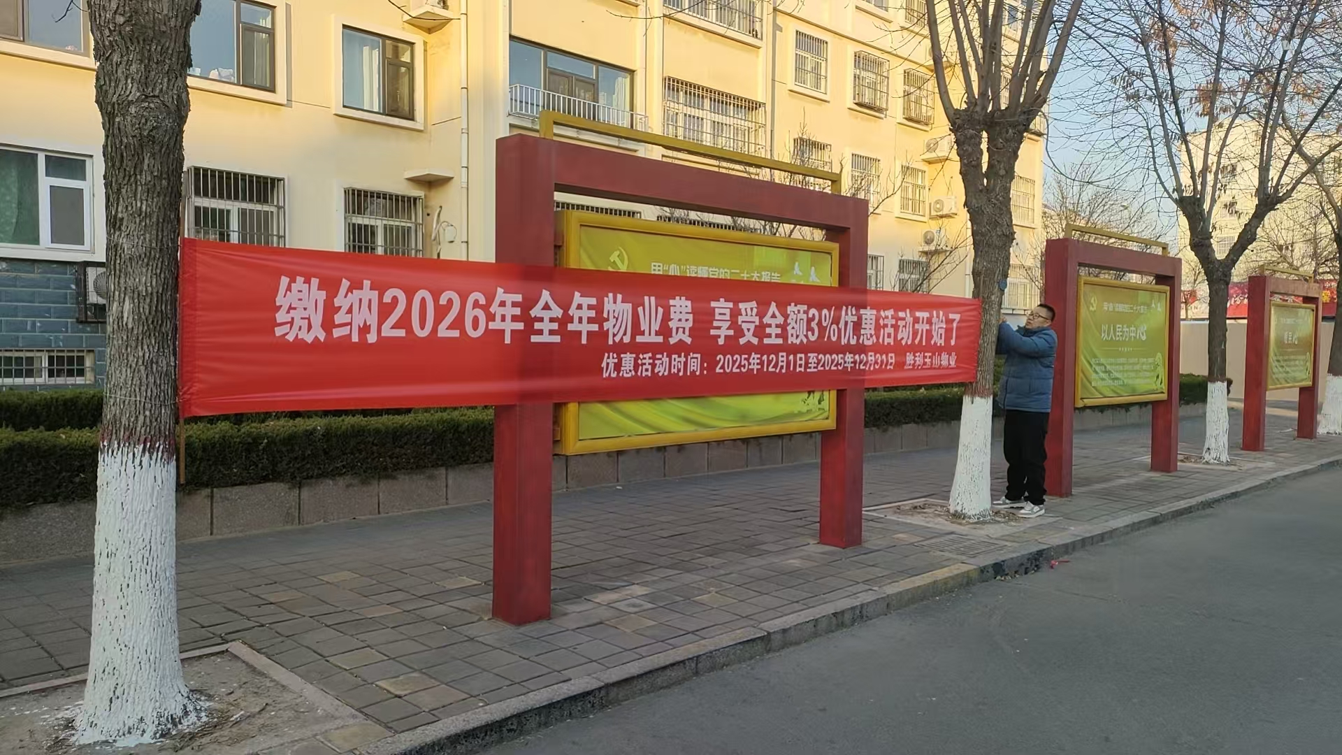 清晨的阳光刚为小区的树梢镀上一层暖黄,胜利玉山物业胜兴事业部的员工们便已整装待发。他们带着提前备好的横幅、梯子与绑扎工具,准时抵达小区的显眼位置,有条不紊地投入到横幅悬挂工作中。经过一番有条不紊的忙碌后,鲜艳的横幅稳稳悬挂于半空,红色的横幅上“缴纳2026年全年物业费,享受全额3%优惠活动开始了!”的字样格外醒目,将核心优惠信息清晰地传递给每一位路过的居民。