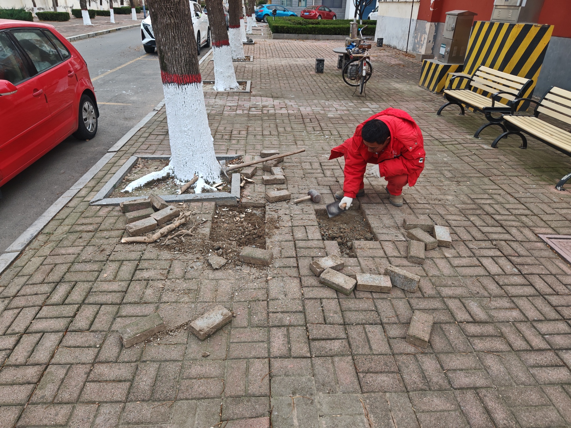 修补现场,维修工作人员操作规范且耐心十足。首先用铁铲将隆起的树根逐一铲断,小心翼翼清理破损路面的旧砖与积土,为新砖铺设筑牢基础。随后将新砖稳稳安放至指定位置,反复调整砖体宽度与摆放角度,确保路面拼接整齐。紧接着用橡胶锤逐块仔细敲实新砖,保障路面平整牢固,避免后续出现松动问题,作业过程中产生的碎砖、泥土也被师傅一一归置清运,保持现场环境整洁。