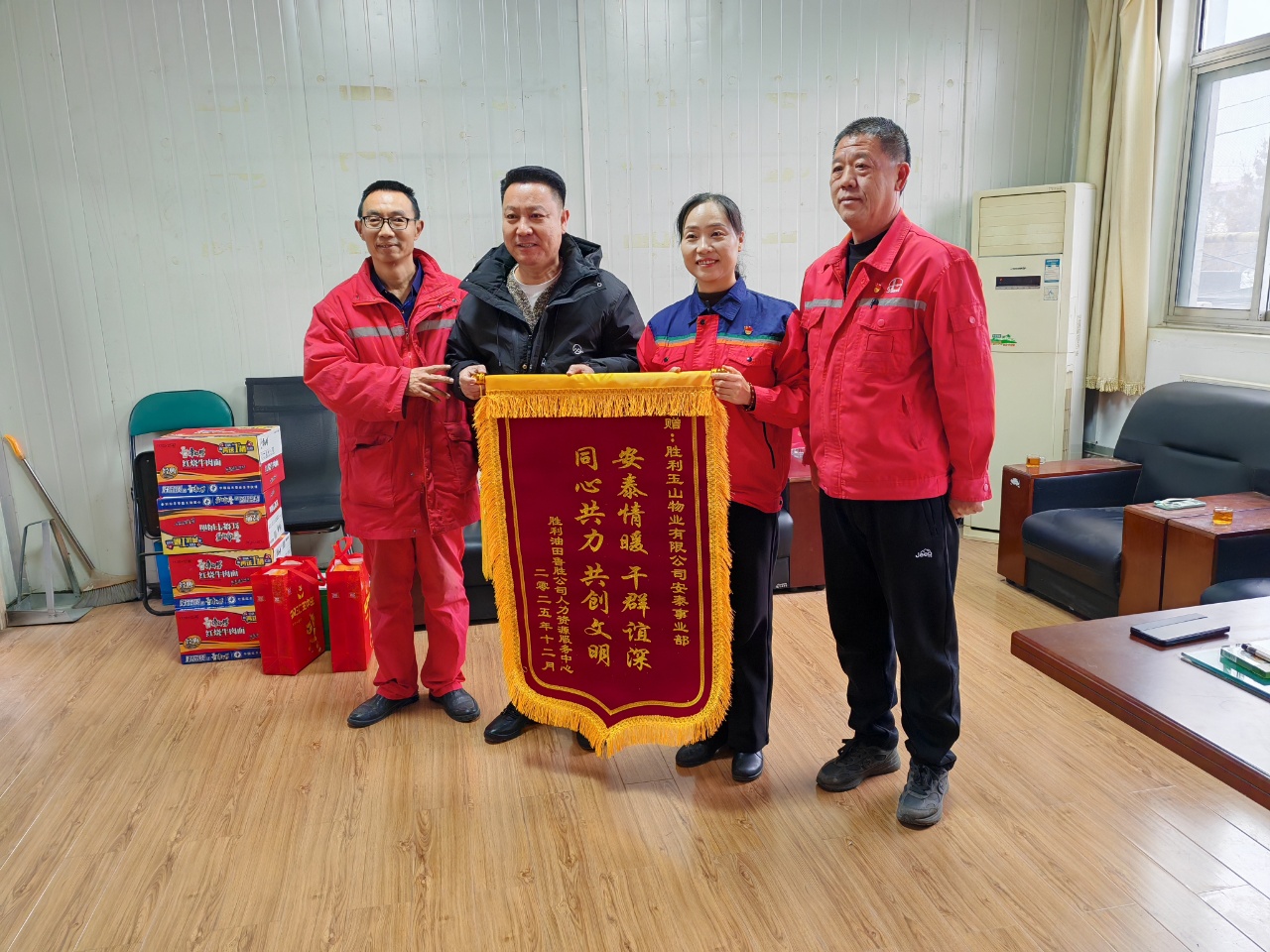 12月22日上午,胜利玉山物业景苑事业部收到了一份特别的心意——鲁胜公司代表带着一面写有“安泰情暖干群谊深,同心共力共创文明”的锦旗,以此感谢景苑事业部在胜荣东区物业服务、环境共建等工作中的鼎力支持,双方工作人员共同参与了赠旗仪式,现场暖意融融。