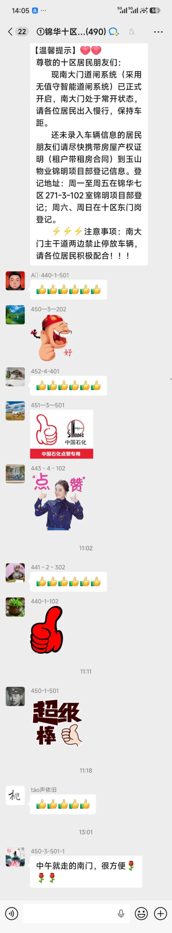 为有效解决这一民生痛点,锦华物业事业部主动对接锦明社区居委会,经过多方调研、科学规划,最终敲定南门开放方案。在南门启用前期,物业工作人员紧锣密鼓推进各项筹备工作,录入居民车辆信息、安装减速带、栅栏,实现人车分流,还设置了安全提示牌,明确标注“一车一杆,请勿跟车,无证车辆绕行东门”等管理要求。同时,物业通过居民微信群发布南门开放通知,清晰告知启用时间及通行规则,确保每位居民知晓相关事宜。