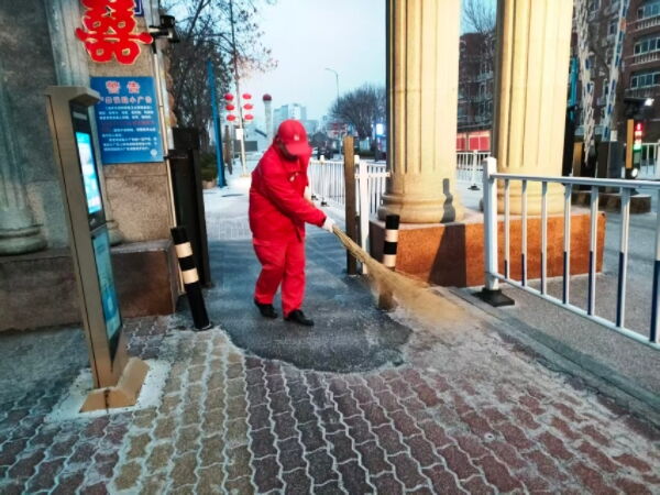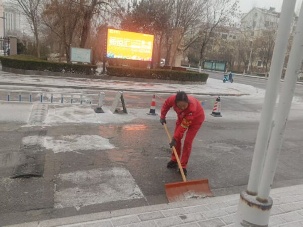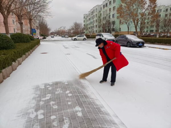 1月18日清晨,寒潮携降雪而至,虽降雪量不大,但低温天气致使路面迅速结冰,给小区居民出行安全带来隐患。