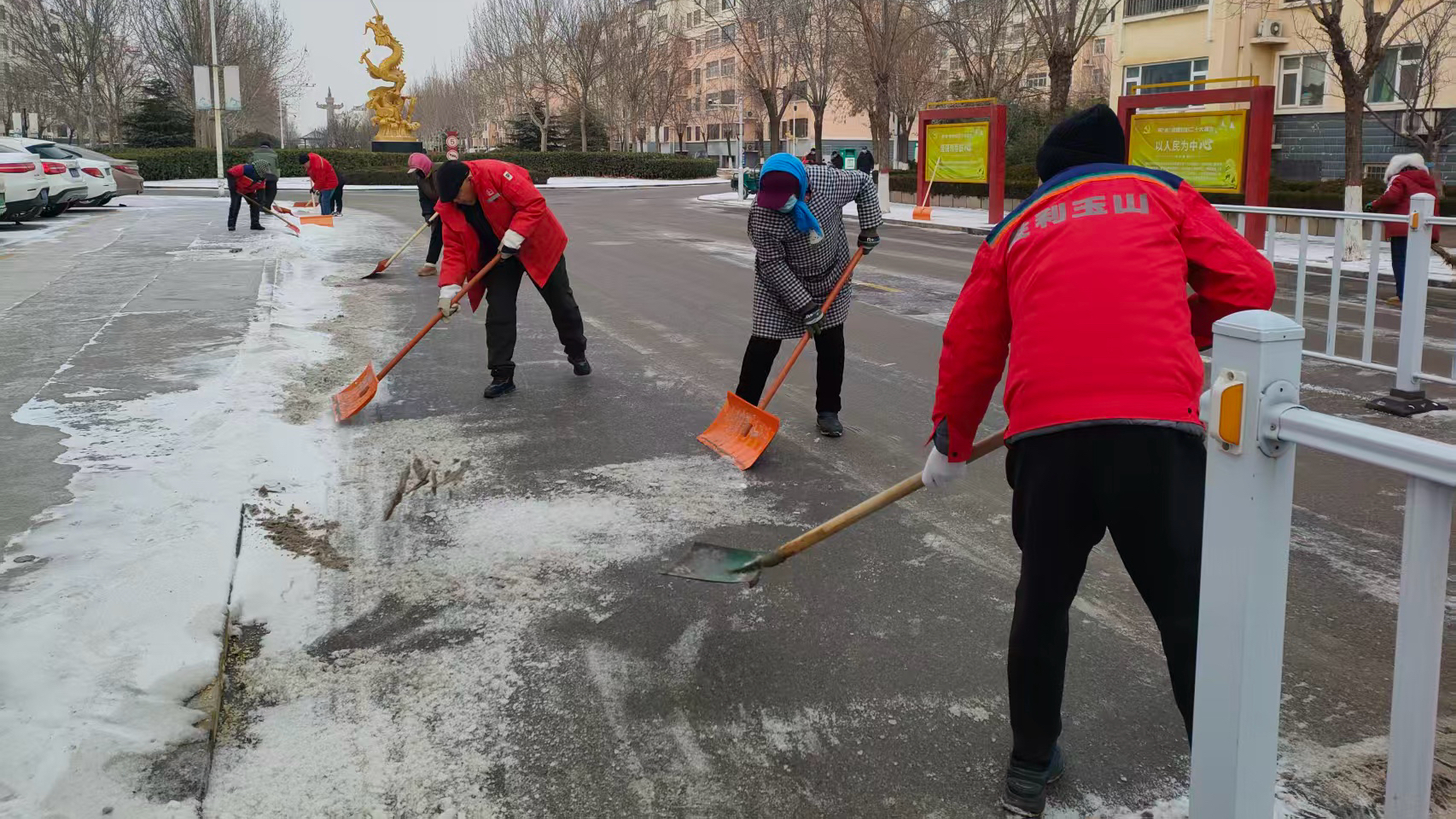 雪情就是命令,保障就是责任。胜利玉山物业胜兴事业部闻雪而动、迅速集结,在小区主干道上,十几把铁锹同时挥舞,橙色的铲斗与冰雪碰撞出清脆的声响;小区广场上,五人一组的清雪队推着雪铲,步调一致地向前推进,厚重的积雪在他们的协作下被推向路边。