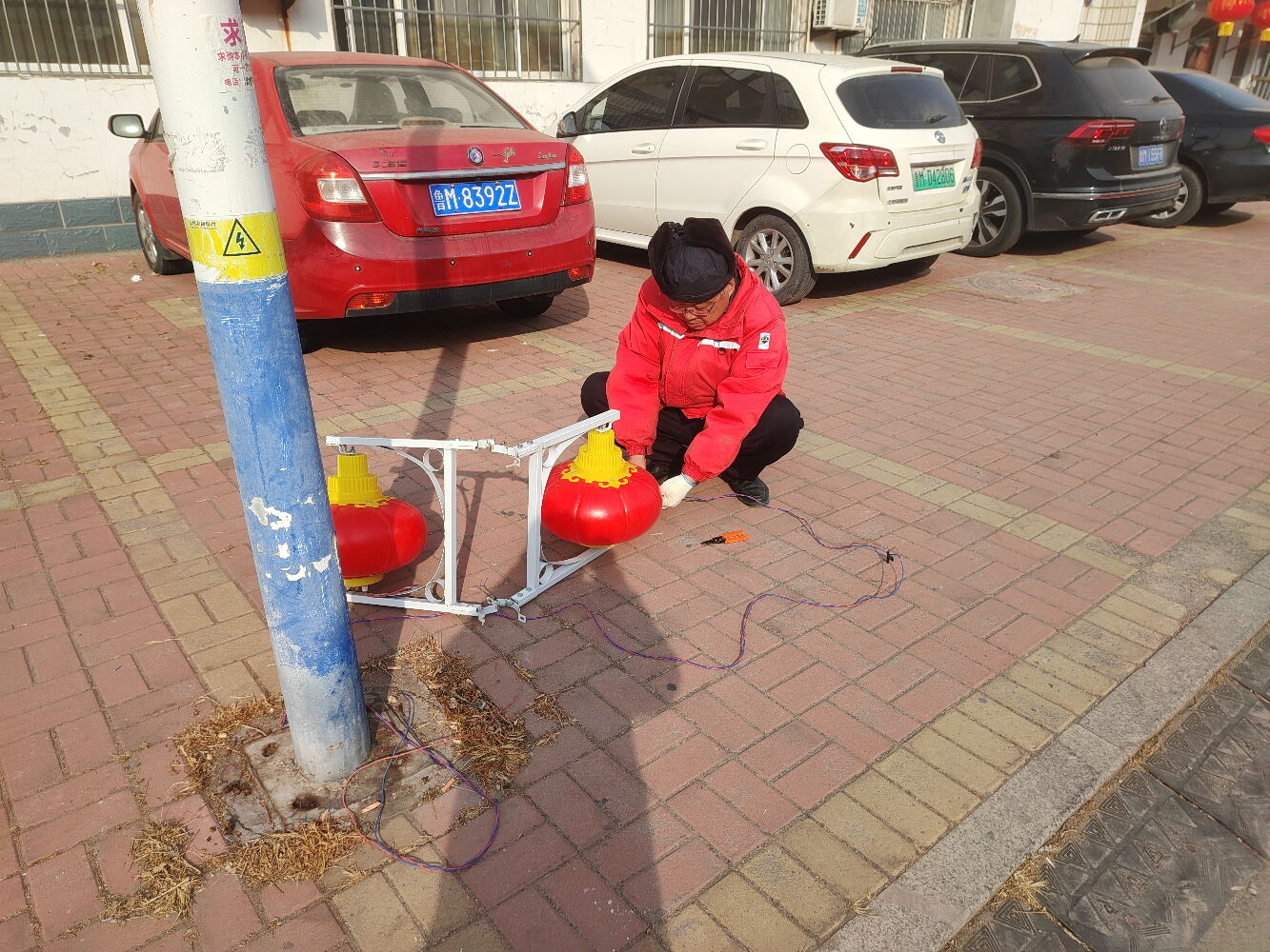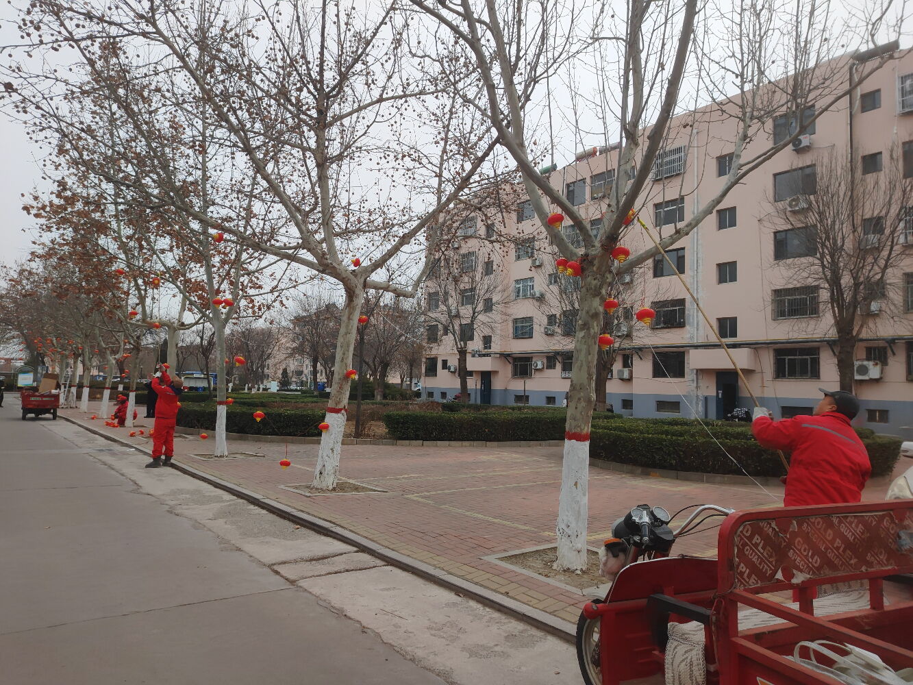 建翔项目的员工在建东、兴滨、建翔三个小区门口主干道两旁的树上、路灯杆上挂起了红红的灯笼和闪光灯带。大家分工明确有的负责分配灯笼理顺线路,有的负责剪断铁丝制作挂钩,有的负责灯笼上穿上挂钩,有的负责有竹竿挑着钩挂树枝,有的负责接上电源线路。为了更好的固定不时将灯笼缠绕在较粗的枝干上,大家配合默契,很快一串串灯笼挂在树上;在建翔南大门一串四个的大大的灯笼挂在大门口的上空,让进出的居民感受到节日的氛围。随后,大家又在东西主干道的灯杆上也挂上了南北对称的灯笼。夜间,一串串火红闪亮的灯笼,给小区增添了浓浓的年味。