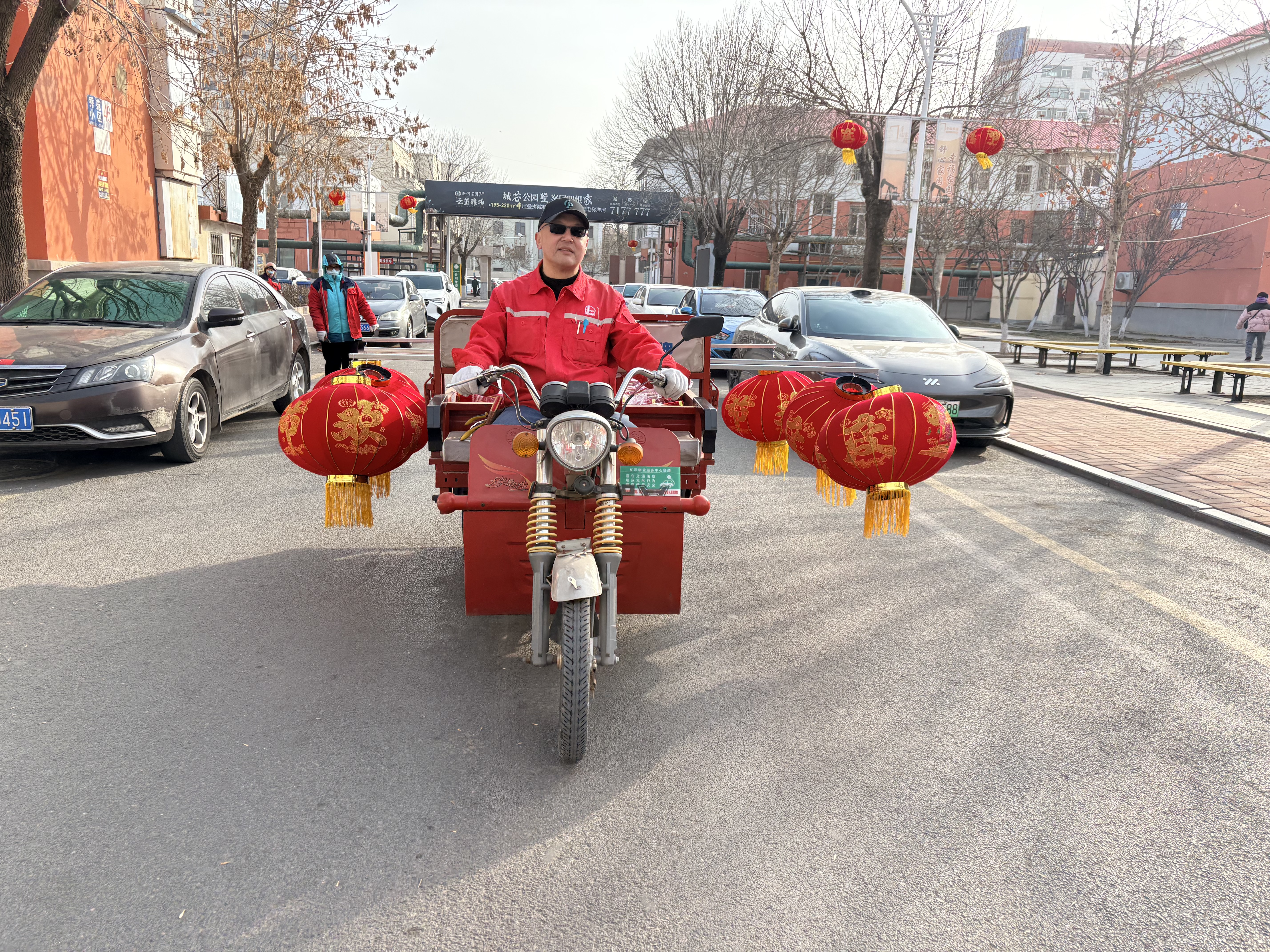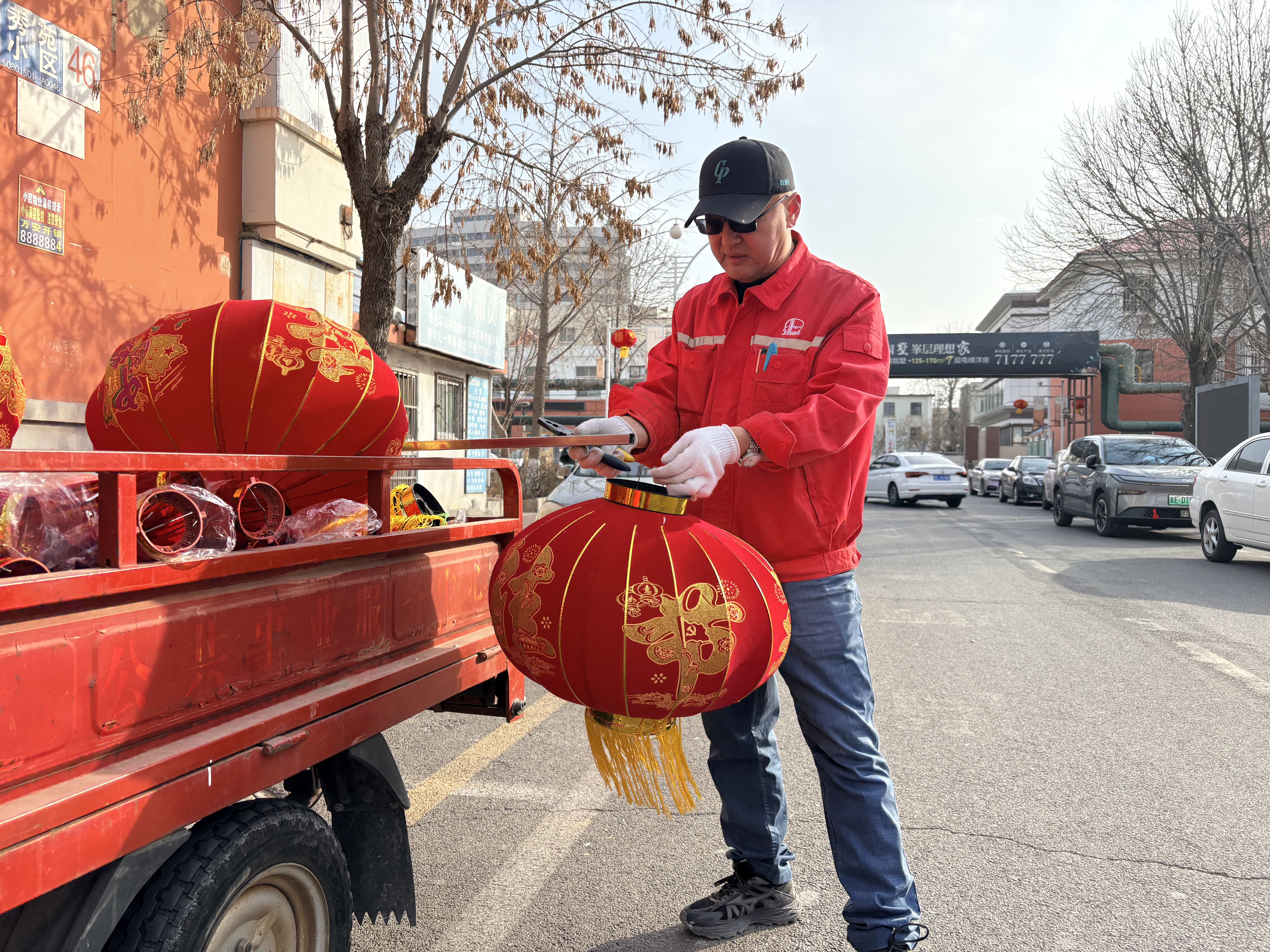 活动现场物业工作人员们分工明确、干劲十足。有的小心翼翼将灯笼从三轮车上搬运下来将印着“欢度佳节”金色字样的大红灯笼撑起来,有的用铁丝固定到钢管的两头,有的踩着梯子登高悬挂,有的在地面负责传递和辅助固定。在冬日暖阳下,一盏盏红彤彤的灯笼被有序挂上小区的路灯杆,小区主干道被红灯笼瞬间点亮,洋溢着喜庆祥和的年味。