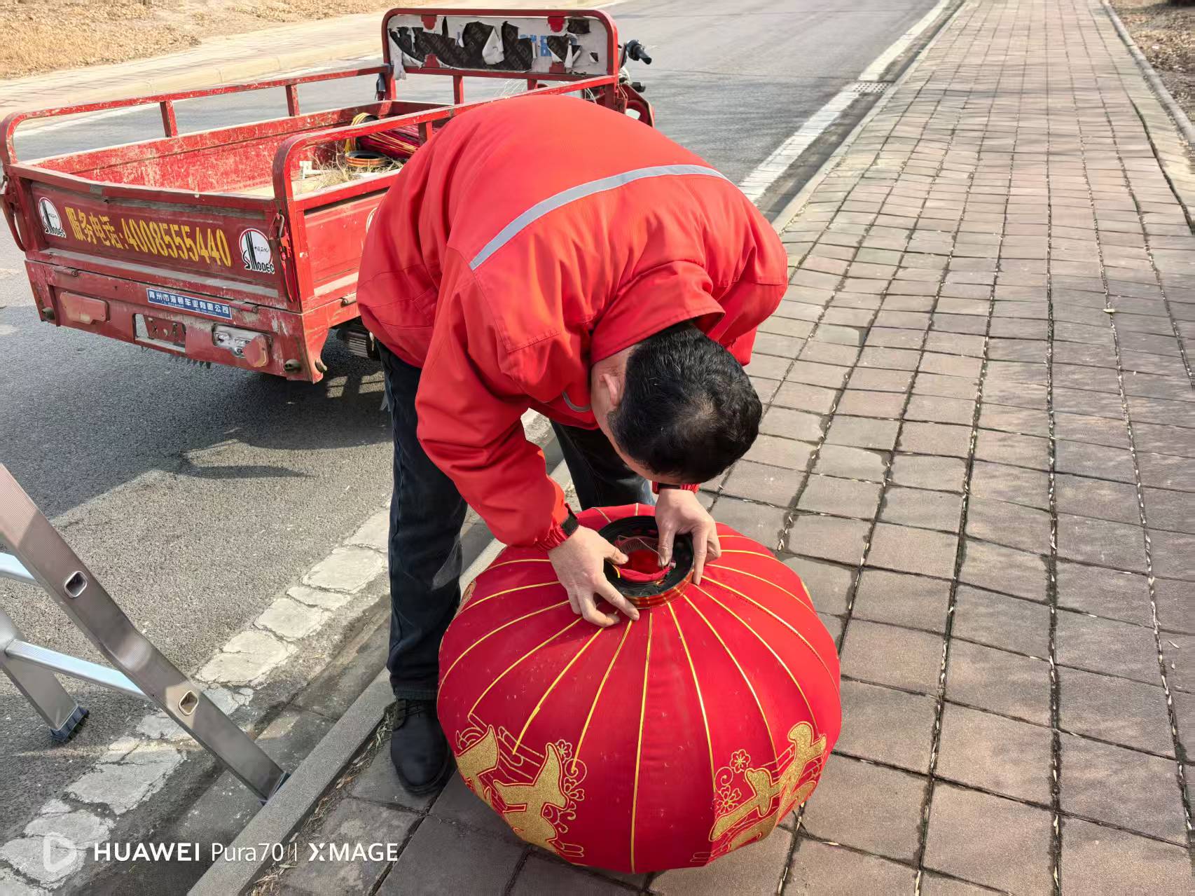 清晨的阳光洒满社区,两人已将满载灯笼、彩灯的工具车停好。李文革率先俯身整理物资,逐一检查灯笼的灯罩、流苏与灯线,将轻微磨损的部件及时更换,确保每盏灯笼都鲜亮完整;王广静则手持布置方案,穿梭在各个点位,精准敲定路灯杆、门岗屋檐的悬挂位置,用马克笔做好清晰标记。