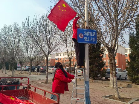 悬挂过程中,工作人员格外细心。针对不同区域的结构特点,他们调整悬挂高度与角度,确保红旗既整齐美观,又稳固安全。遇到居民经过,大家总会笑着道一声“提前祝新春快乐”,居民朋友们也纷纷驻足点赞,有老人拿出手机记录这喜庆的场景,有孩童围着飘扬的红旗欢呼雀跃,邻里间的问候与笑声,伴着红旗的猎猎声,交织成最动人的新春序曲。