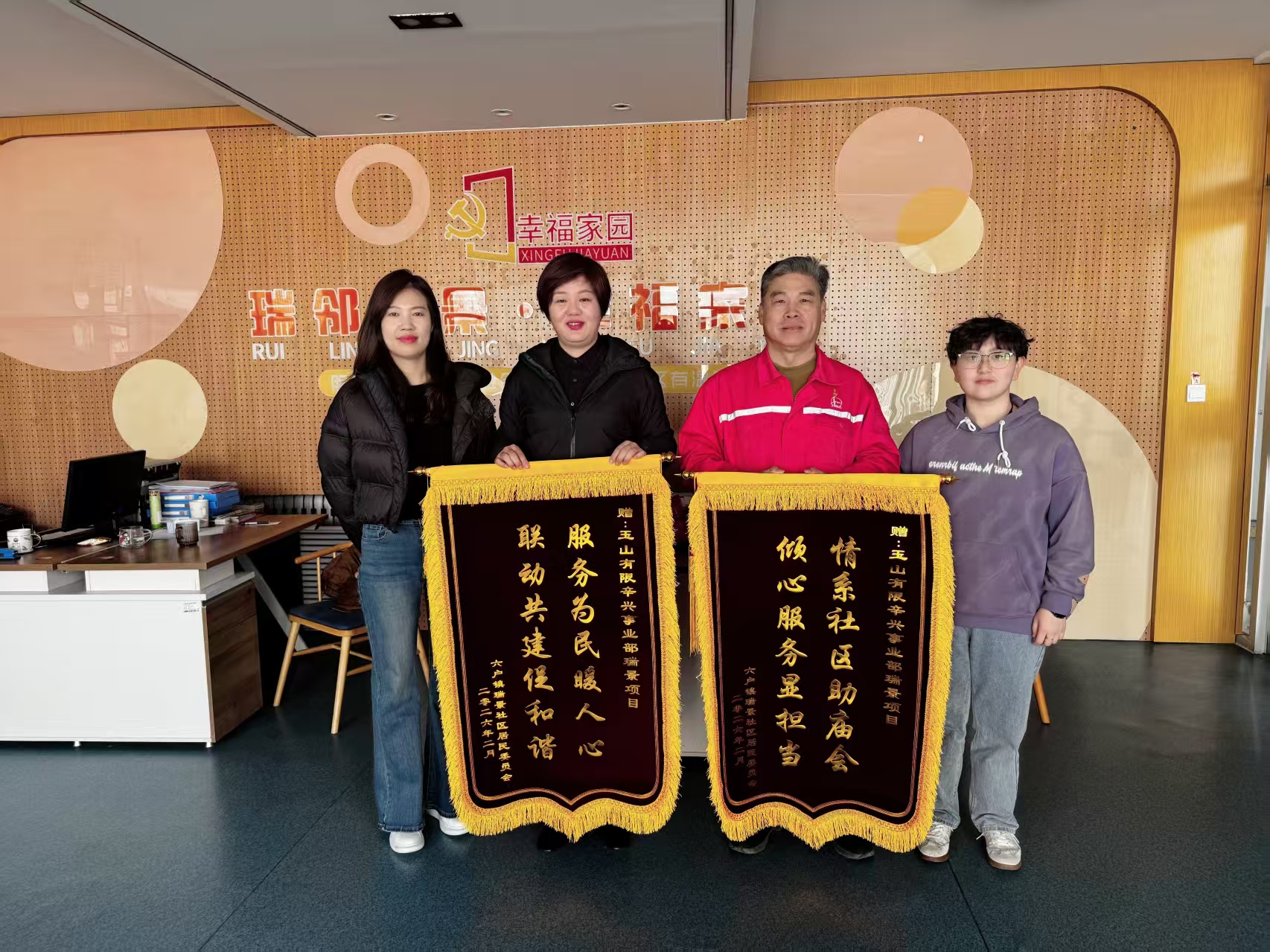 2月27日上午10时左右,胜利玉山物业辛兴事业部瑞景项目经理办公室迎来了3位客人,他们是东营区六户镇瑞景社区居委会的张丽媛书记及其同事,她们把写有“情系社区助庙会,倾心服务显担当”“服务为民暖人心,联动共建促和谐”的2面锦旗送到了瑞景项目经理张健手中,并不停是说着:庙会的成功举办离不开你们的热心帮助。