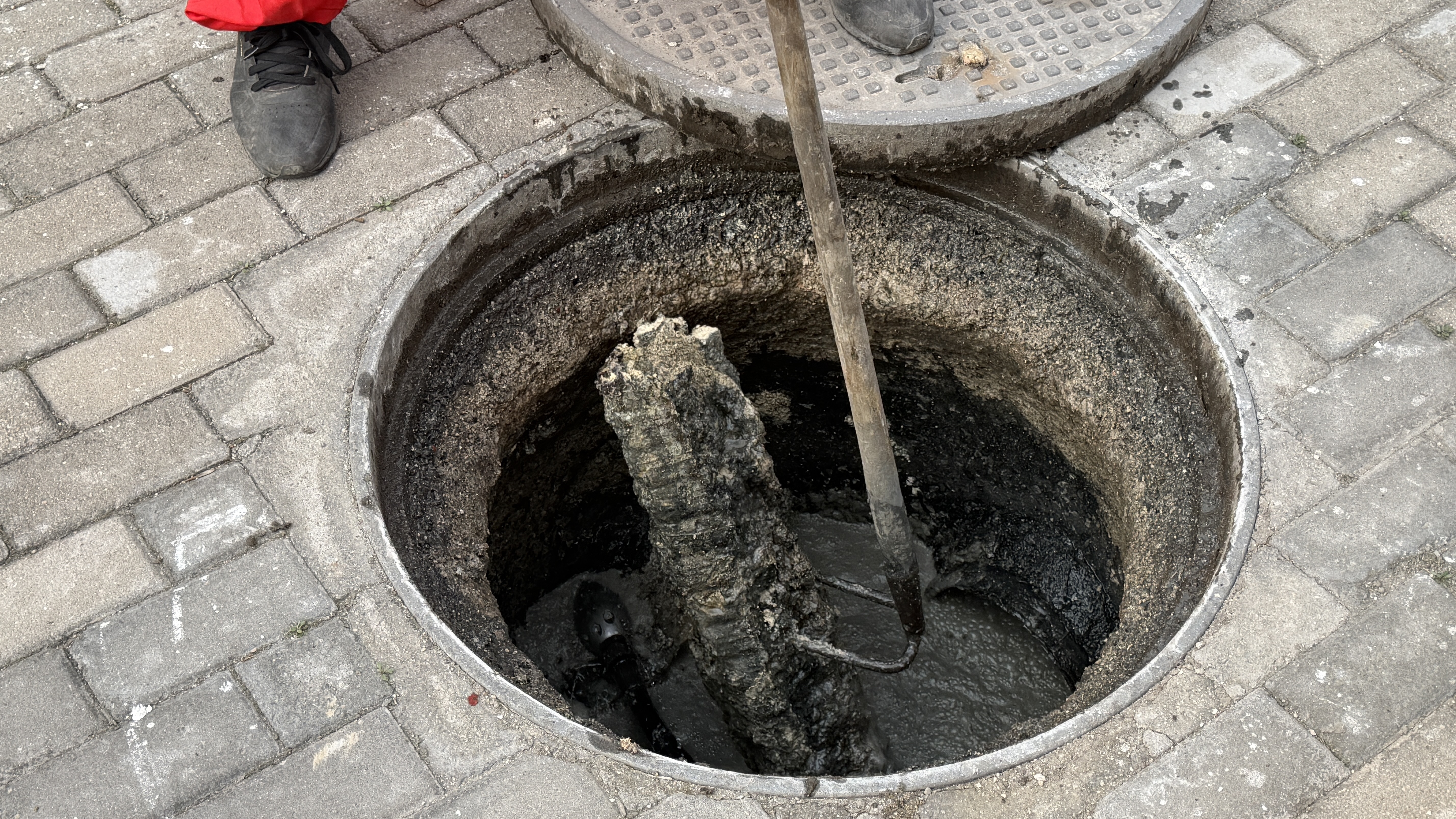 经过全力奋战,管道内淤积的堵塞物被逐步清理,一块坚硬的长方形油块成功取出,堵塞隐患彻底消除。待下水道恢复畅通、地面污水排净后,胜兴事业部并未止步于此,而是对管道进行全面冲洗,反复确认排水顺畅、无残留堵塞物后,立即对现场进行清理。