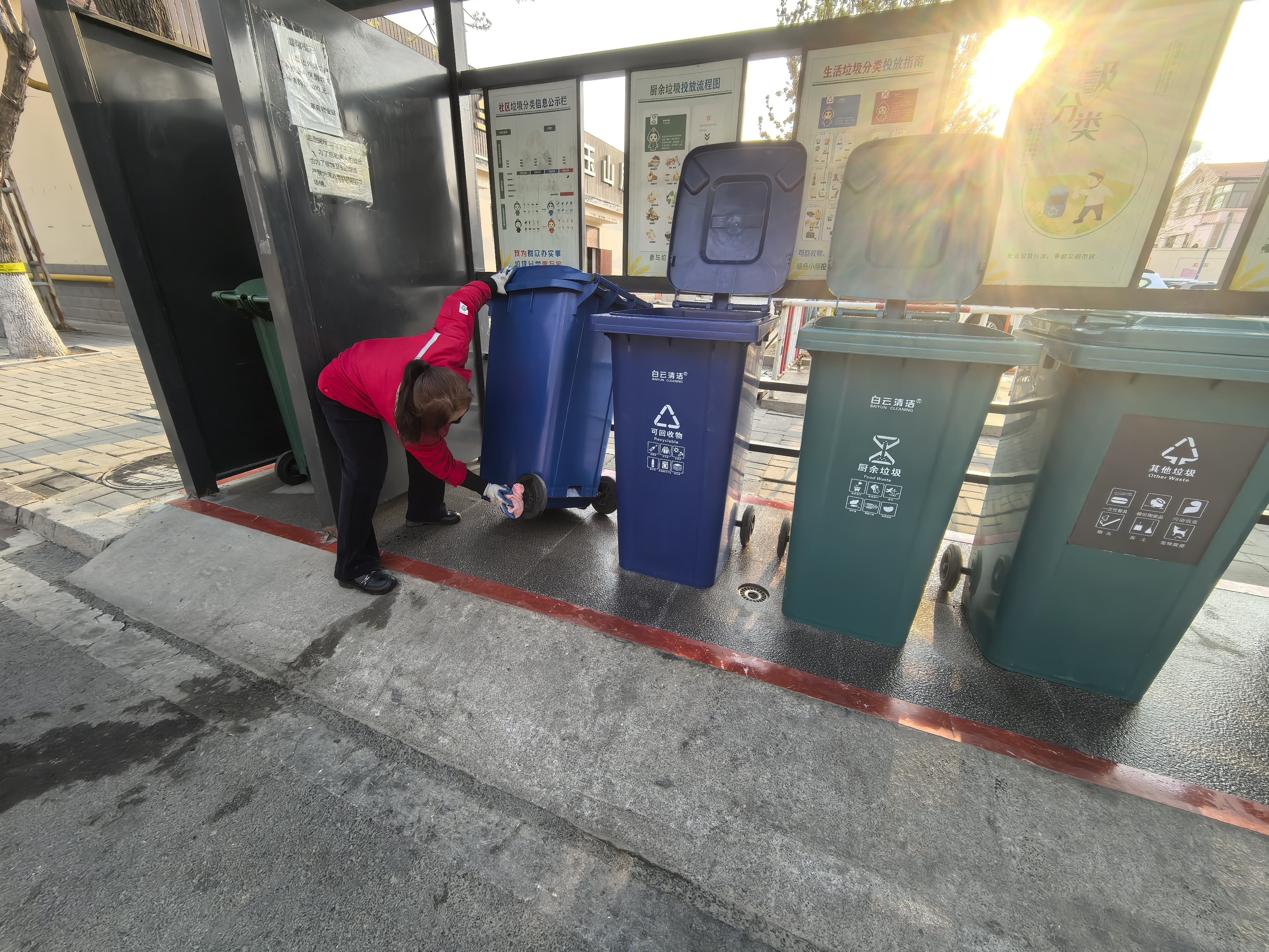 垃圾桶管理也有章法。定期清洗桶体,污渍异味一并去除,连同摆放的台面也刷洗得干干净净,桶身擦得锃亮,摆在那儿清清爽爽,和周边环境融为一体。