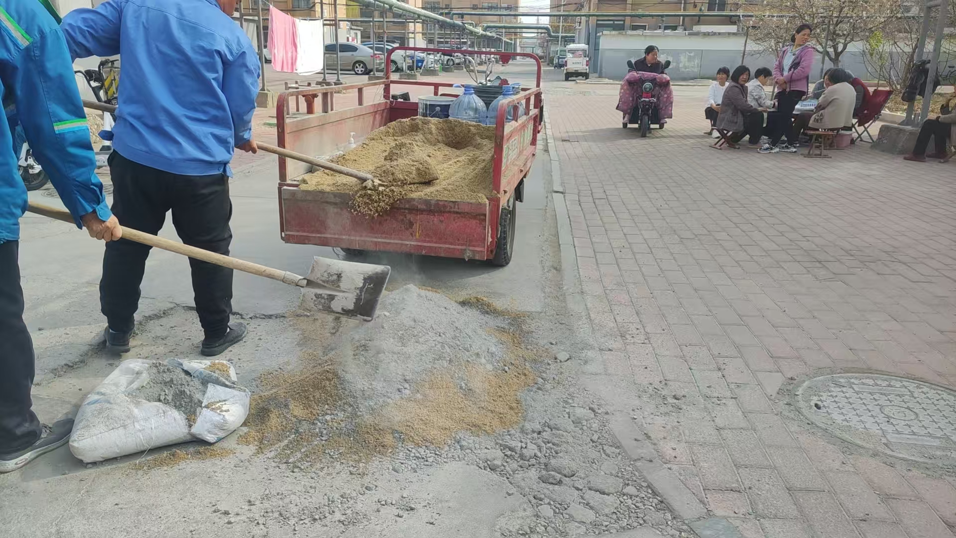 作为老旧居民小区,小区内部道路开裂、地面出现坑洼、楼道内墙皮脱落------这些“衰老”现象虽然不会对小区业主的正常居住生活造成大的影响,但还是会影响到小区的整体环境和业主的生活感受。为了提升小区整体环境,辛兴事业部决定自力更生、组织员工自己动手进行“修补”。他们买来了沙子、水泥、花砖、腻子、涂料等原材料,然后对所服务的辛兴小区、工农小区、瑞景小区、建工小区、辛民小区、耿井小区等进行摸排,看那段路面起砂、裂纹、坑洼,看哪个地方花砖有破损,哪个单元墙皮脱落------数据摸准了,修补工作也就开启了。3月26日上9点,辛兴事业部的维修人员先从辛兴一区45号楼西侧的水泥路面开始,他们两人1组,将沙子和水泥按标准搭配和好后,用铁锨、铲子、抹泥刀一步步将坑洼、裂纹补平抹匀。为了节约材料,维修人员直到将和好的水泥全部用完才收工。负责修补墙皮脱落的员工,则是先将起皮起泡的旧墙皮铲下来,用腻子找平,再抹上涂料。
