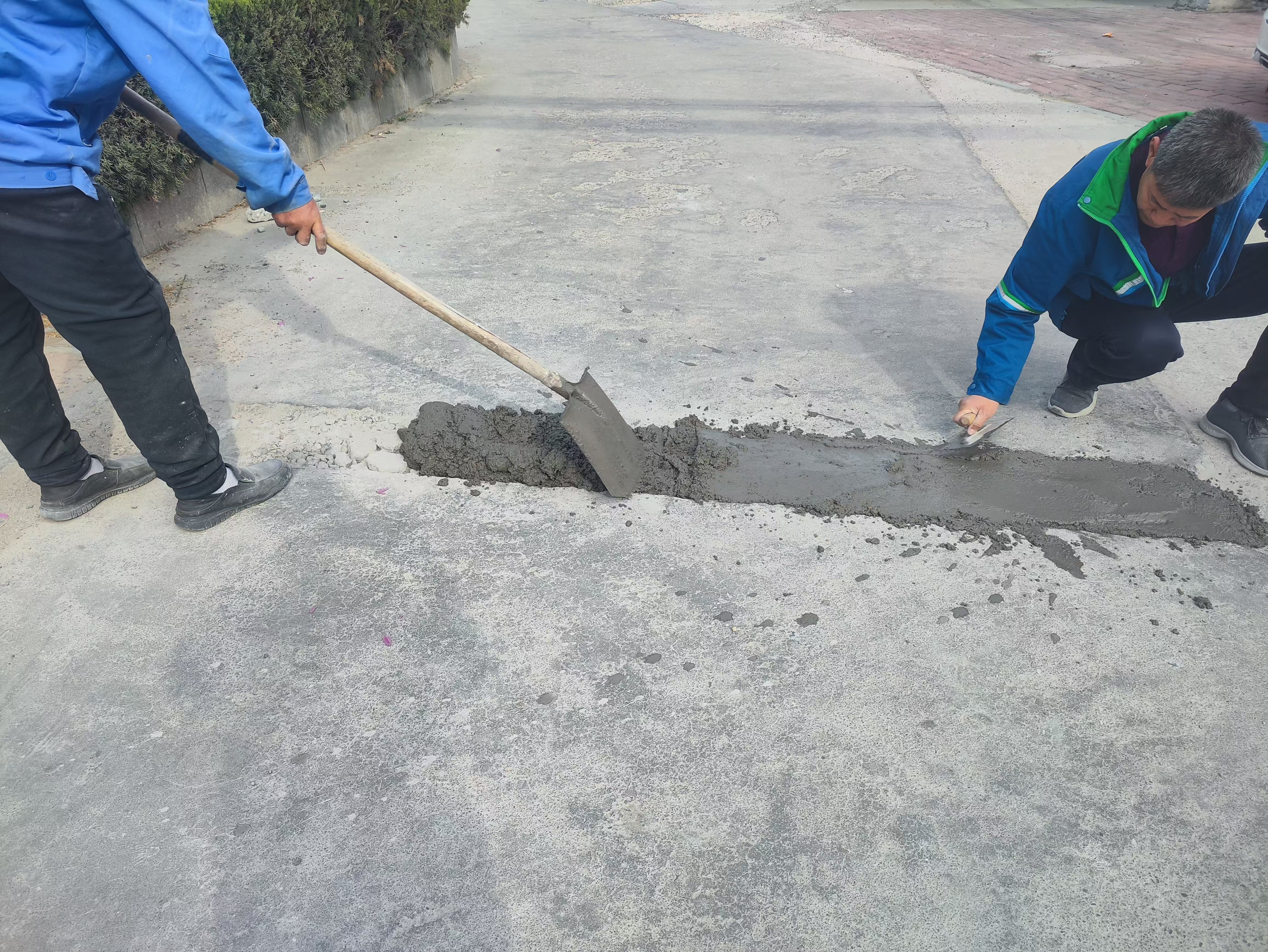 3月26日上午11点半左右,胜利玉山物业辛兴事业部辛兴小区45号楼西侧的水泥路上,2名维修员工仍在施工,他们把和好的水泥均匀的涂抹在水泥路面的缝隙里,原本布满纵横交错纹路的路面变得平整了起来。