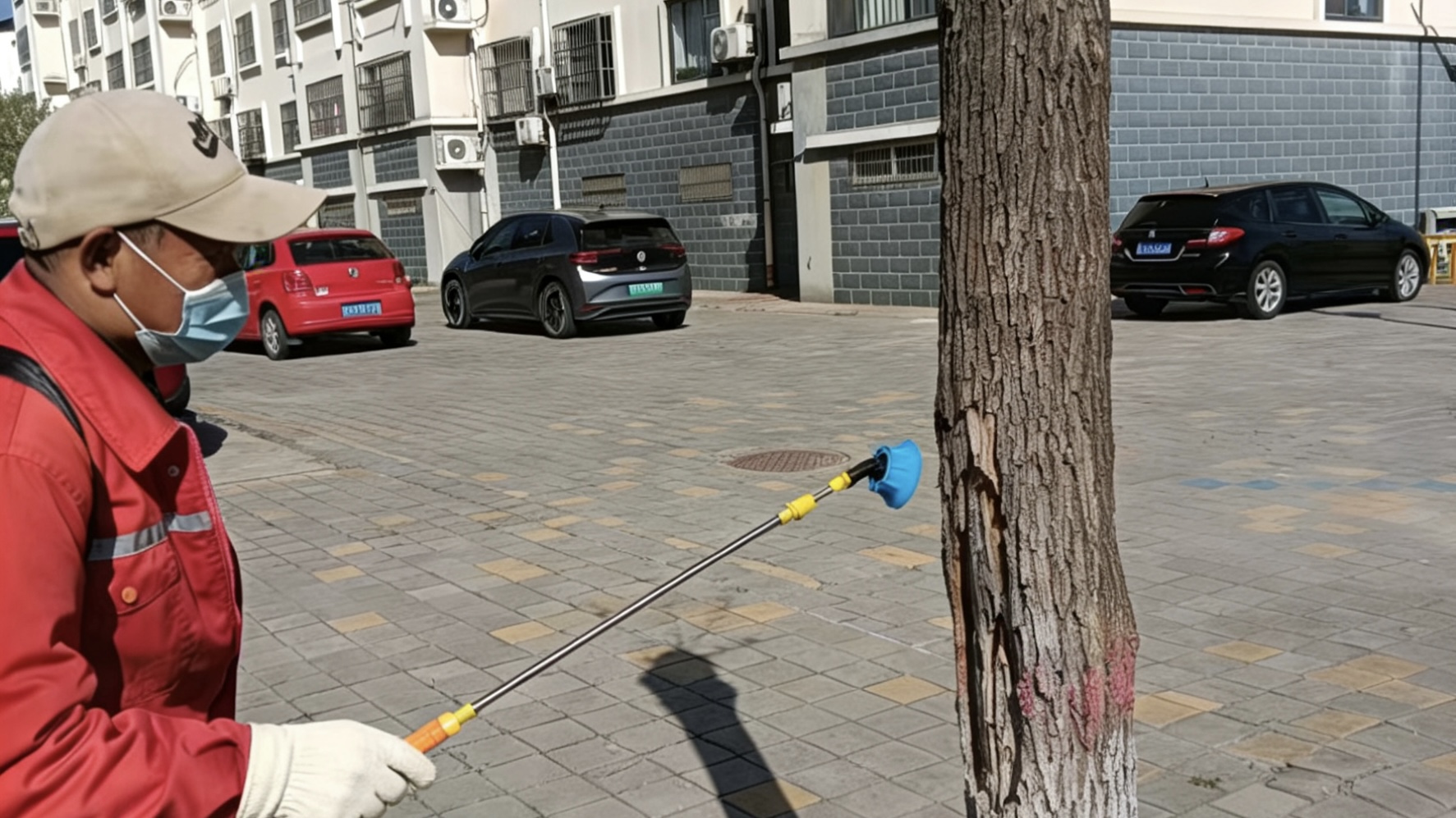 作业现场,工作人员身着统一工装,佩戴口罩、手套等防护装备,身背蓝色药桶,手持红色喷雾杆,正地对小区道路砖缝、绿化带边角等杂草易滋生区域进行精准喷洒。每一次按压喷头,药剂都均匀覆盖在杂草叶面,工作人员步履沉稳,逐行逐段排查,不放过任何一处杂草死角。