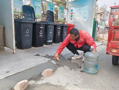 胜利玉山物业瑞达事业部瑞东项目的工作人员在日常巡视过程中,发现天鹅小区垃圾分类亭的地面因长期使用出现破损坑洼问题。为避免居民出行不慎绊倒,保障小区整体环境整洁与出行安全,瑞东项目第一时间开展应急抢修,及时消除安全隐患。