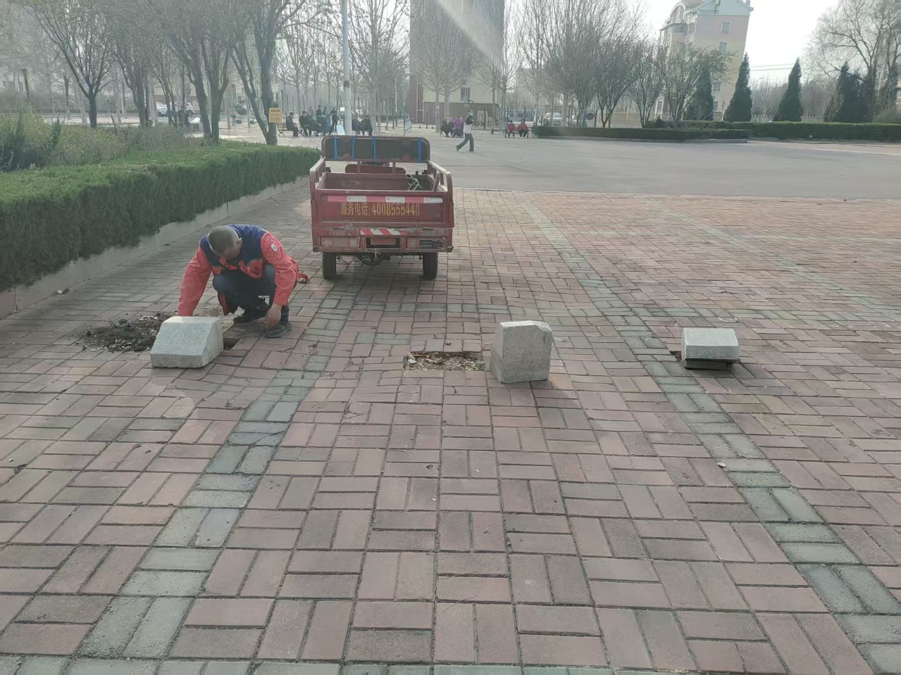 物业人员先清理损坏墩体与坑槽,再精准定位,用水泥砂浆固定新的花岗岩隔离墩。整个过程高效规范,以最快速度完成了隔离墩的复位加固。