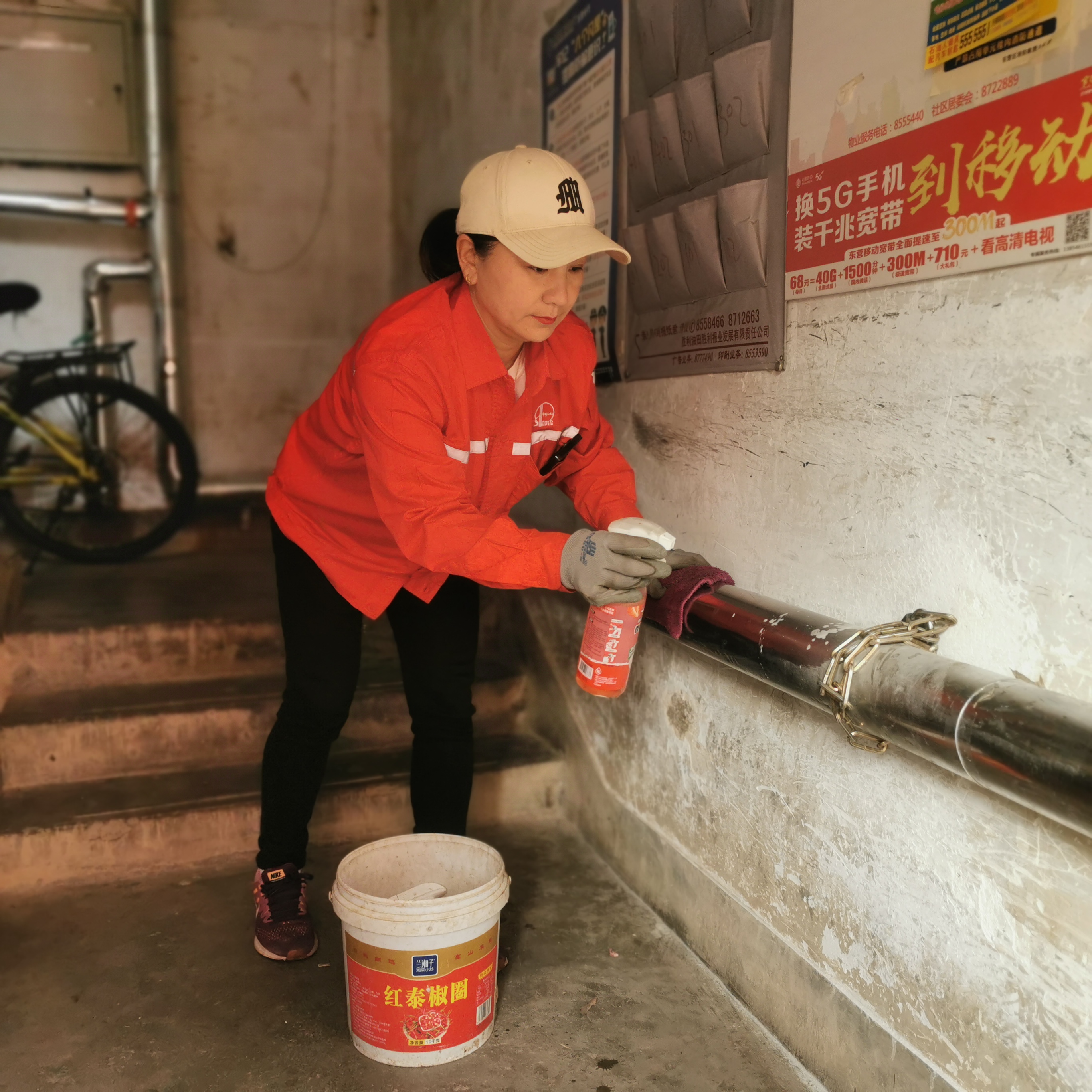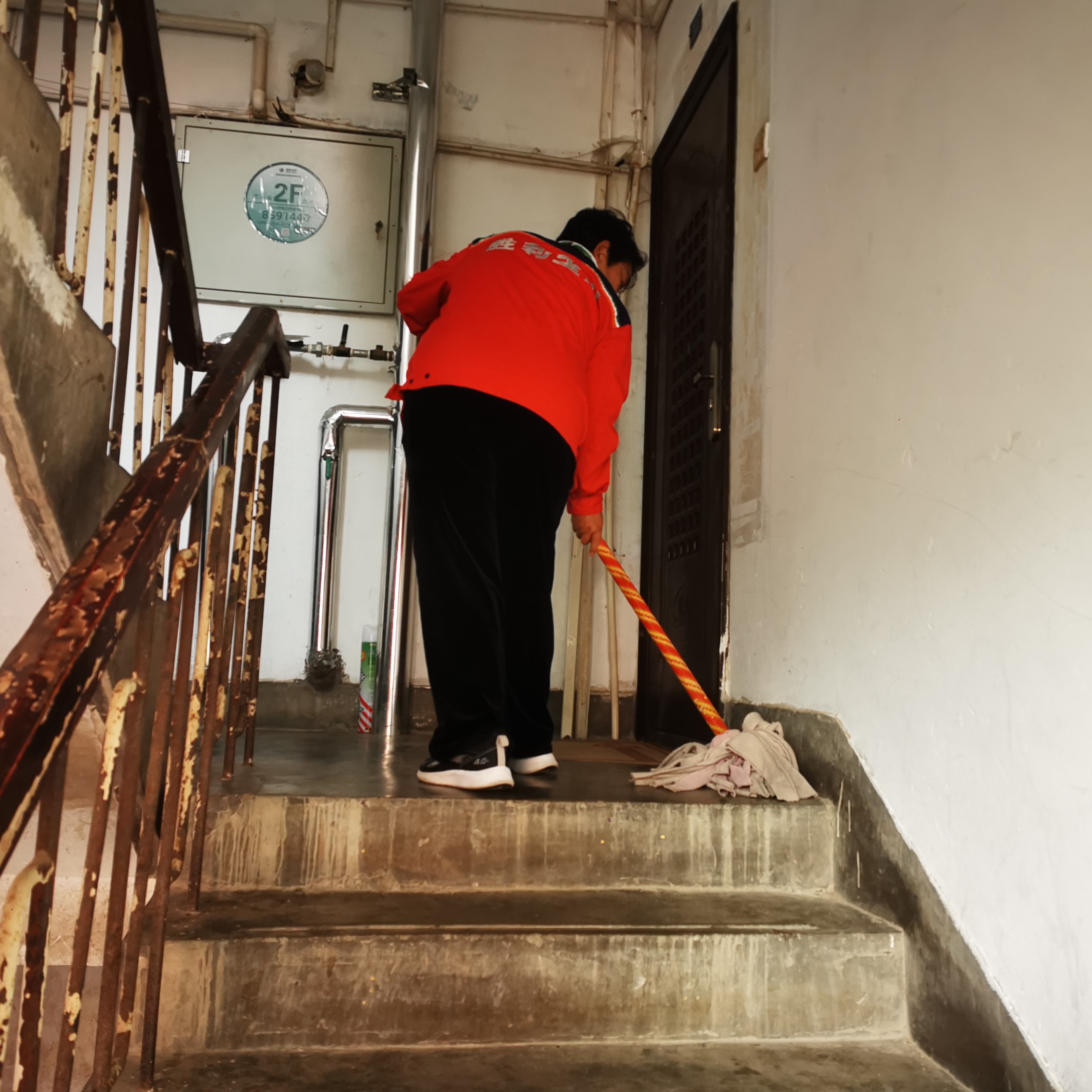 楼道、窗台、门前区域作为日常高频接触空间,也是本次整治的核心环节。大家分工协作,手持拖把、抹布对单元楼道地面进行反复拖洗除尘,擦拭楼道扶手、墙面边角污渍。仔细清理窗台轨道内的灰尘、碎石残渣,精细化扫除卫生盲区;逐户对一楼门前杂物进行规整清运,劝导乱堆乱放行为。